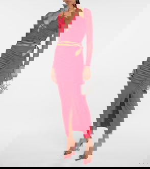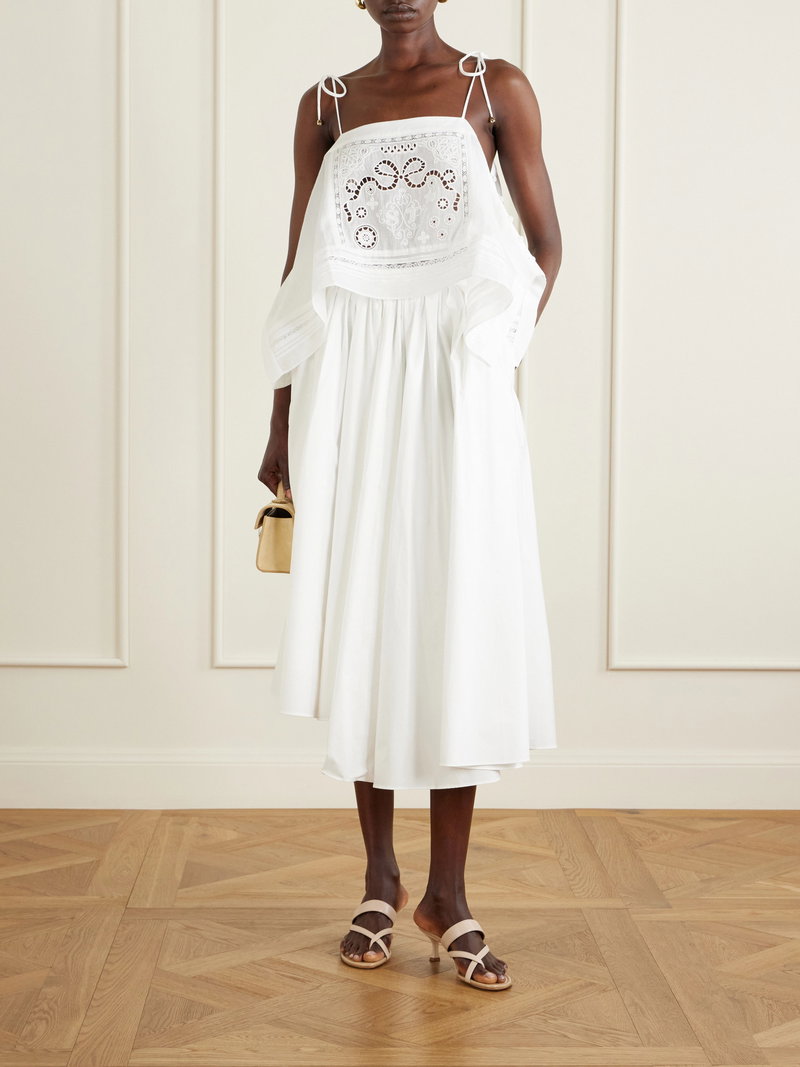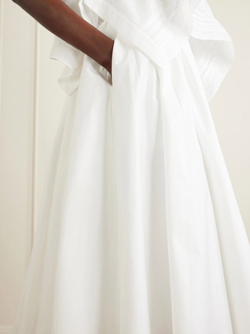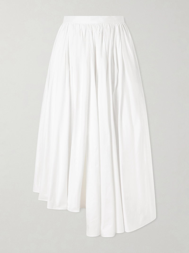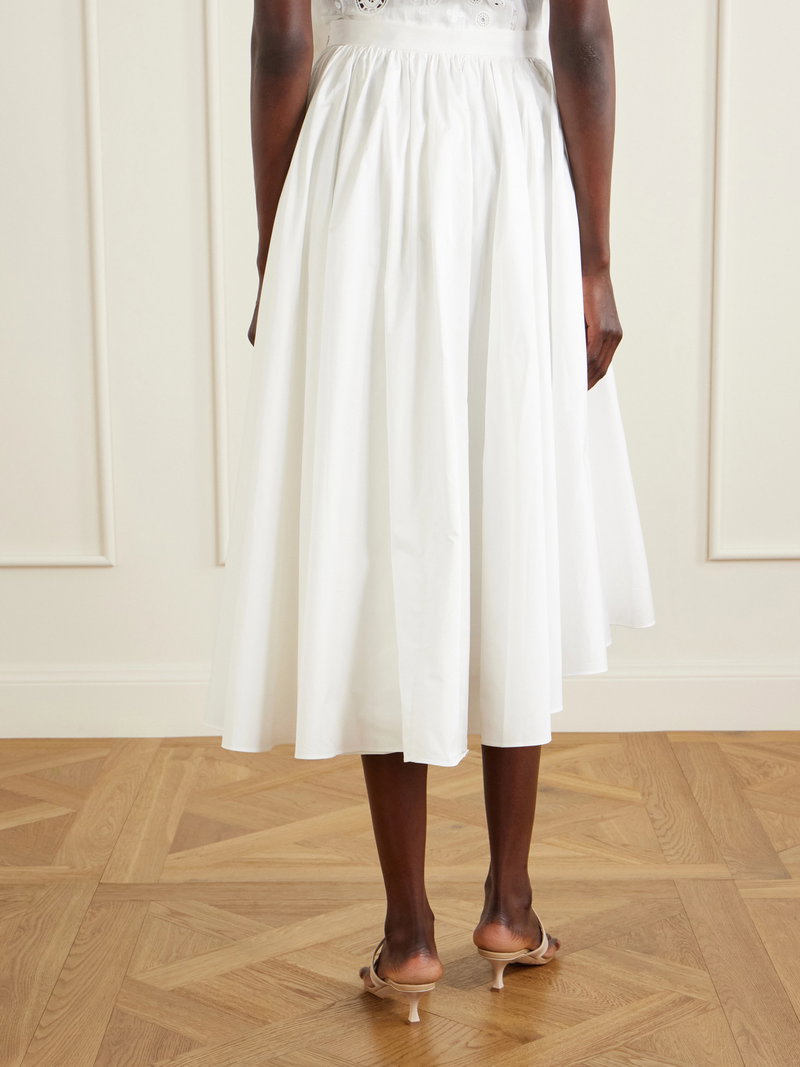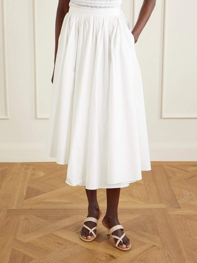 Self-Portrait’s skirt has an almost weightless quality. Cut from crisp cotton-poplin, it’s gathered through the waist and falls to an asymmetric hem that sways softly with each step. Style it with the matching top for a romantic finish.