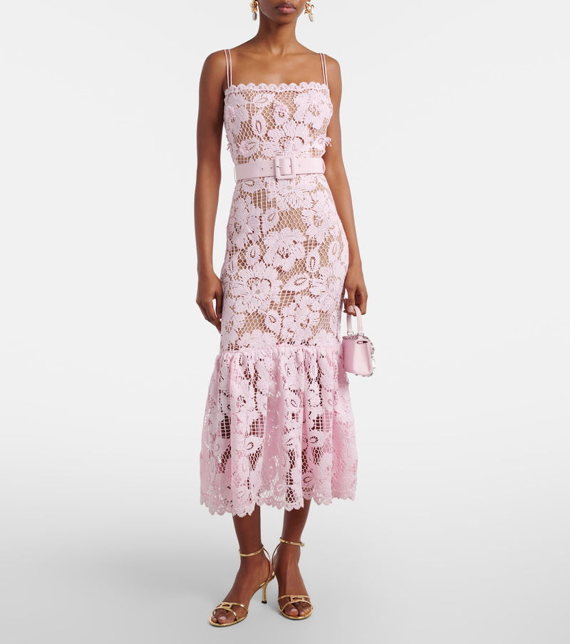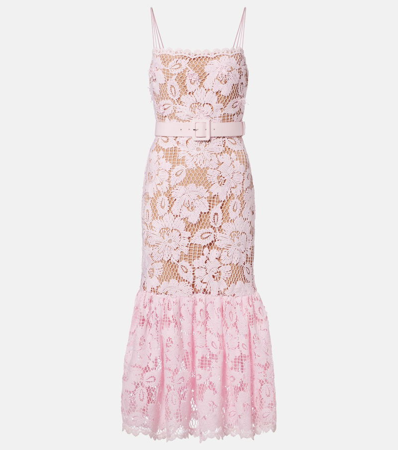 With a mission to celebrate women in every design, Self-Portrait has built a strong cult following for its soft, graceful aesthetic. This pink-hued midi dress features a floral crochet construction, a belted waist, and an elegant mermaid silhouette.
