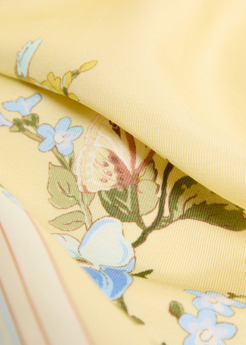 • Floral print, sweetheart neckline, tie-fastening shoulder straps, button fastenings through front, belt loops, buckle-fastening belt, split at front hem, fully lined