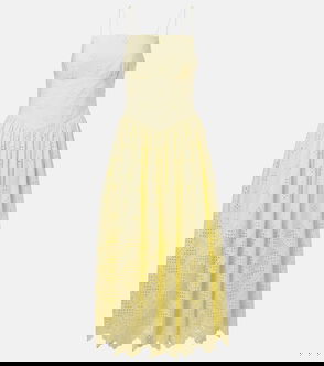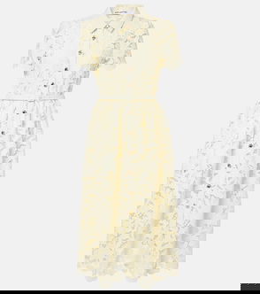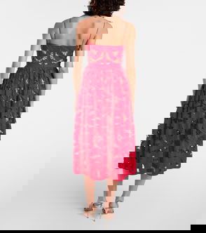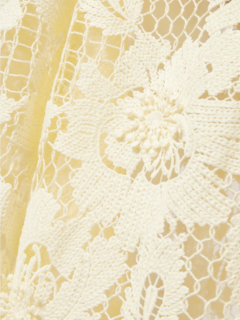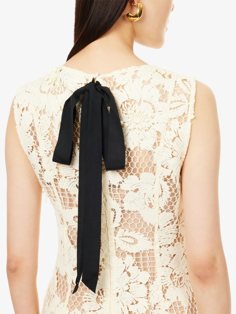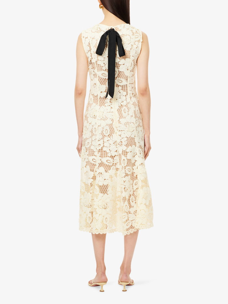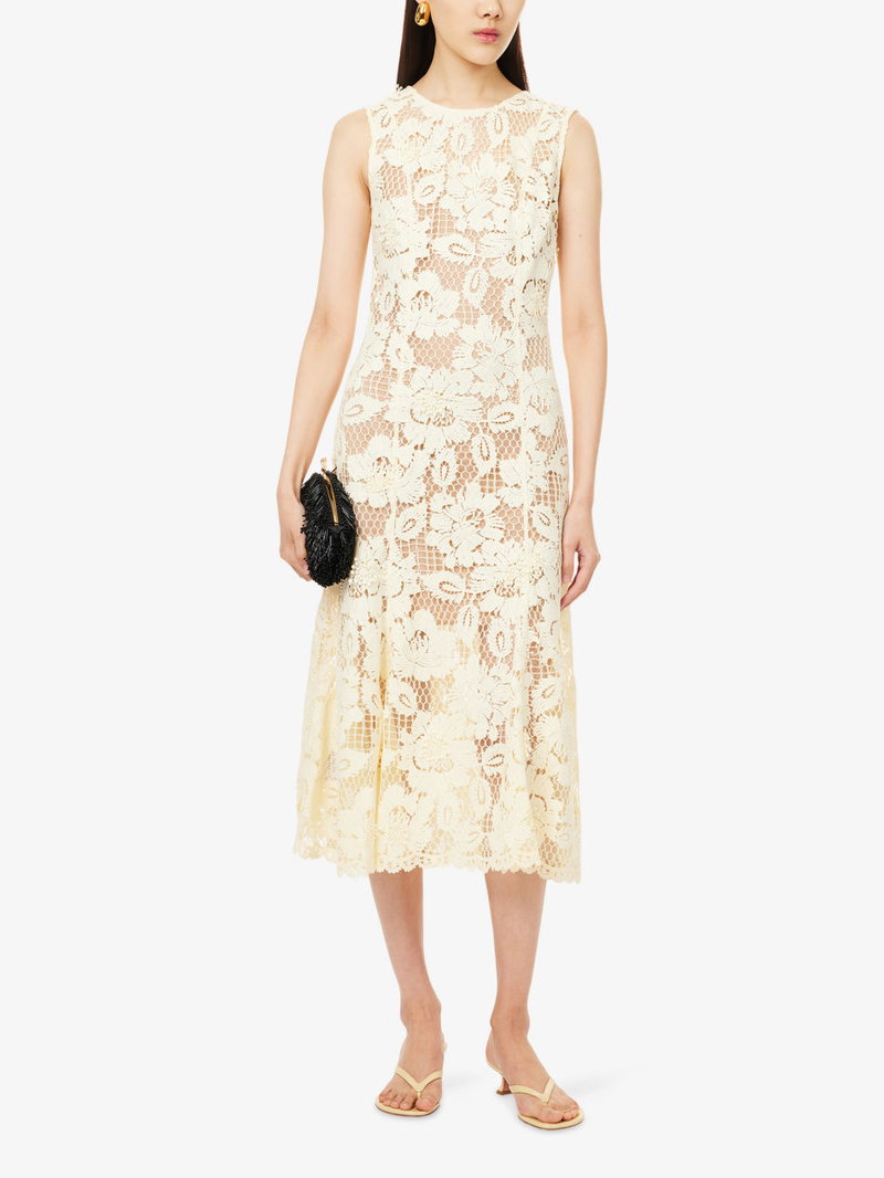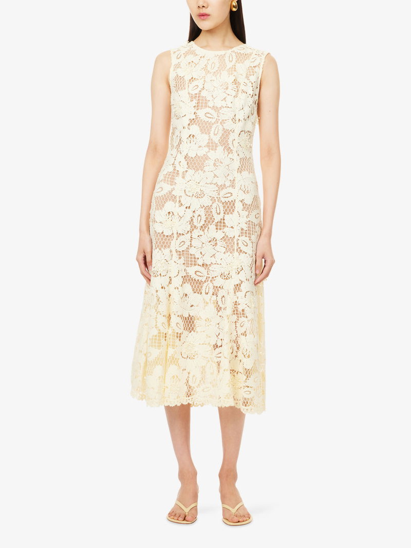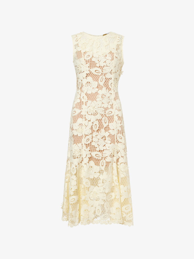 Slim fit, round neck, sleeveless, scalloped hem, fit-and-flare silhouette, all-over floral lace design, midi length, removable cami lining