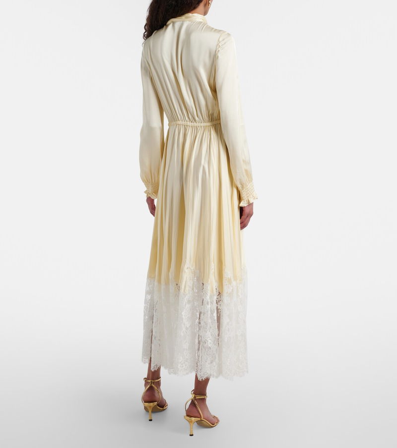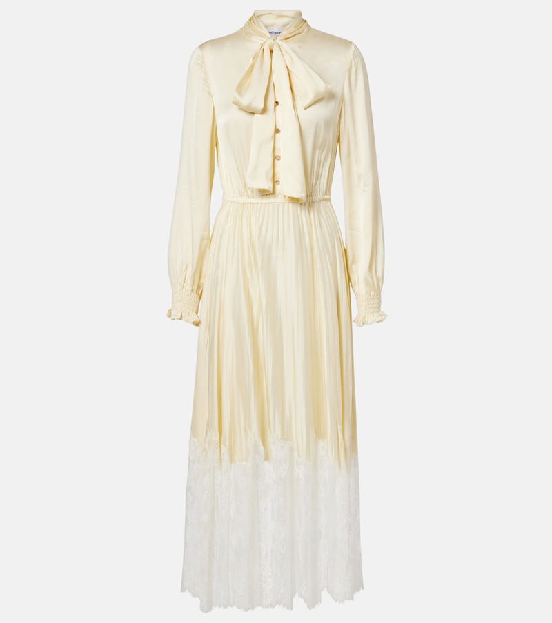 With a mission to celebrate women in every design, Self-Portrait has built a strong cult following for its soft graceful aesthetic. This midi dress is made from lustrous satin with a lace hem and a self-tie neck.