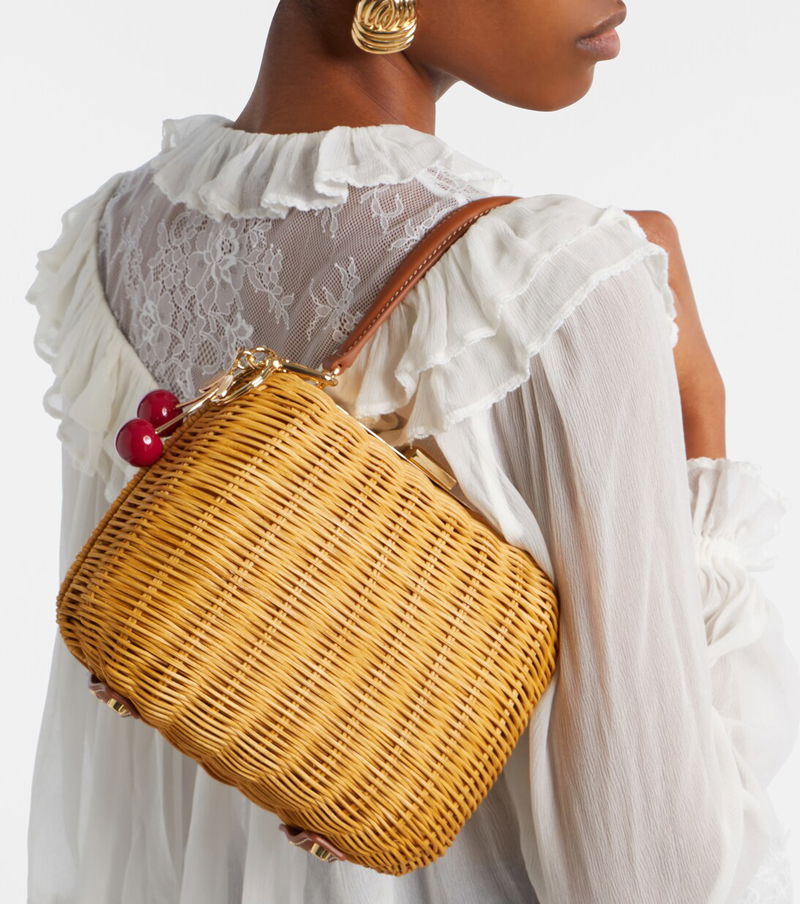 A charming style in compact proportions, this top-handle bag is made from rattan and features a cherry charm.