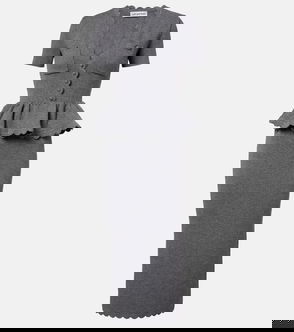 Slim fit, round-neck, padded shoulders, short sleeves, two buttoned pockets at front, peplum, beaded trims, all-over knitted, textured