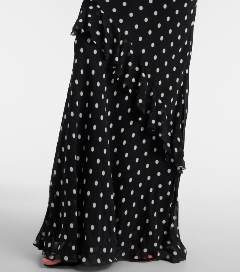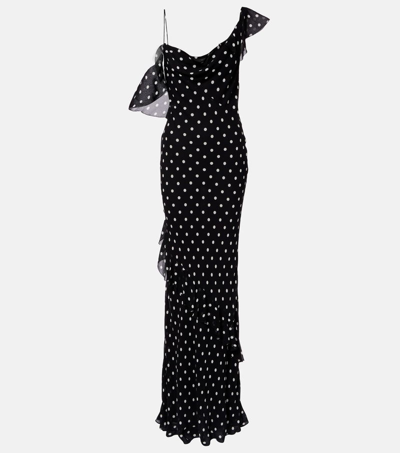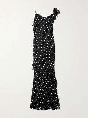 With a mission to celebrate women in every design, Self-Portrait has built a strong cult following for its soft graceful aesthetic. This gown is crafted from lightweight georgette with a polka dot pattern and fashioned into a ruffled, one-shoulder silhouette.