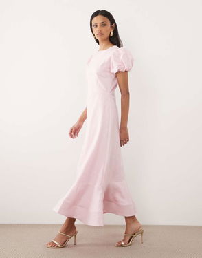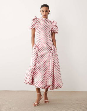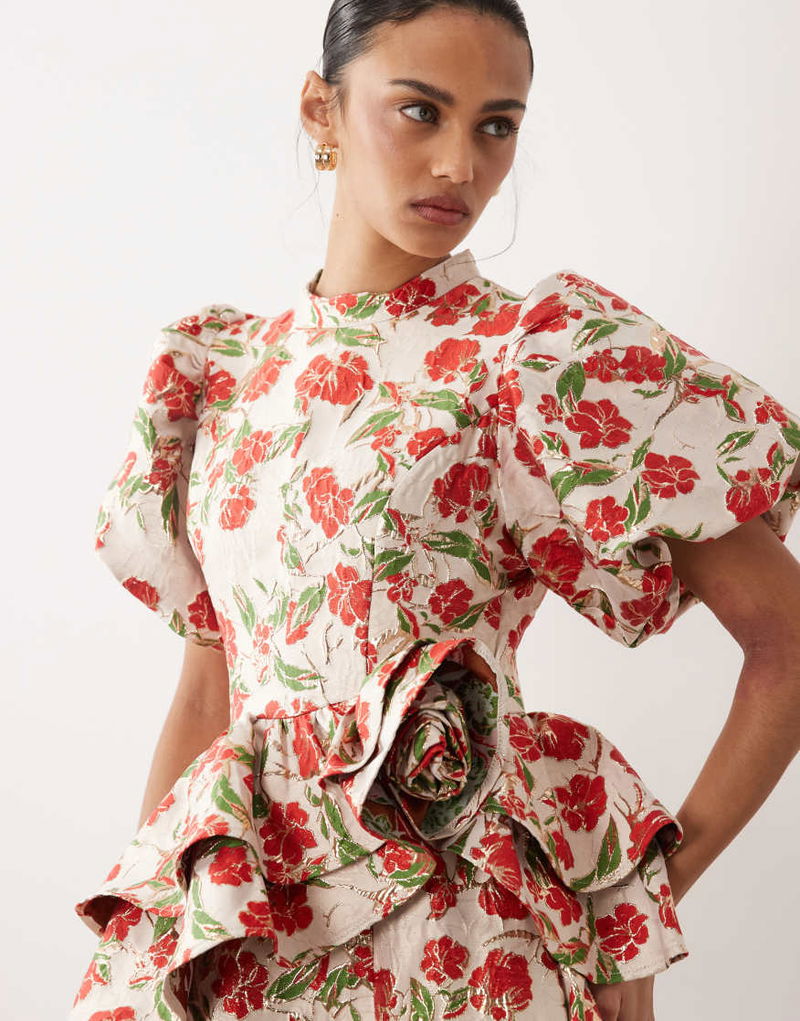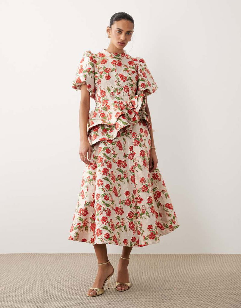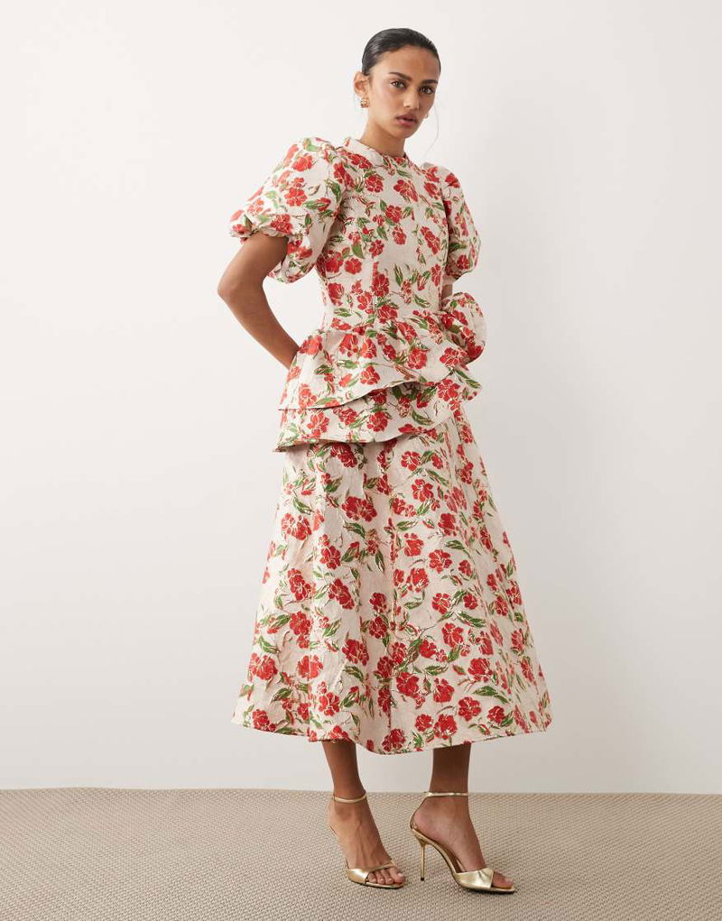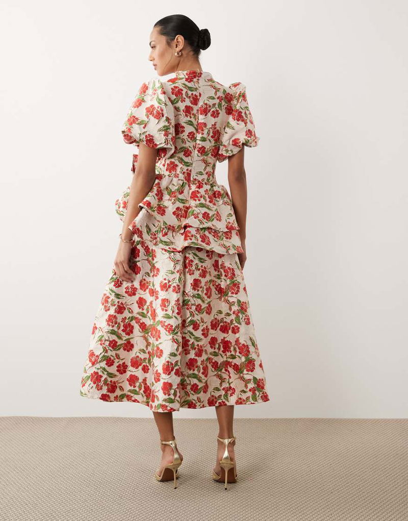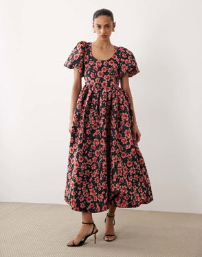 Dream floral jacquard puff sleeve midi dress.