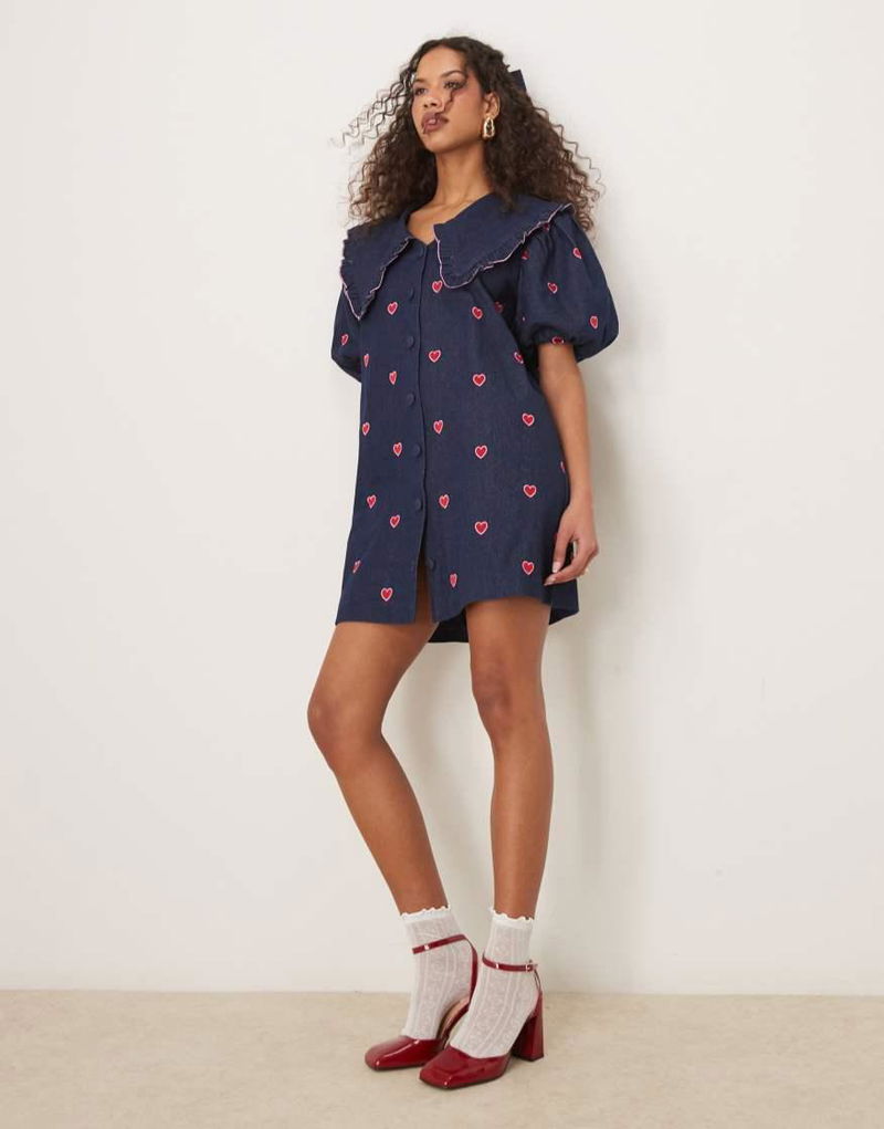 Dress for the date Oversized collar Button-through front Puff sleeves Heart embroidery details Regular fit.