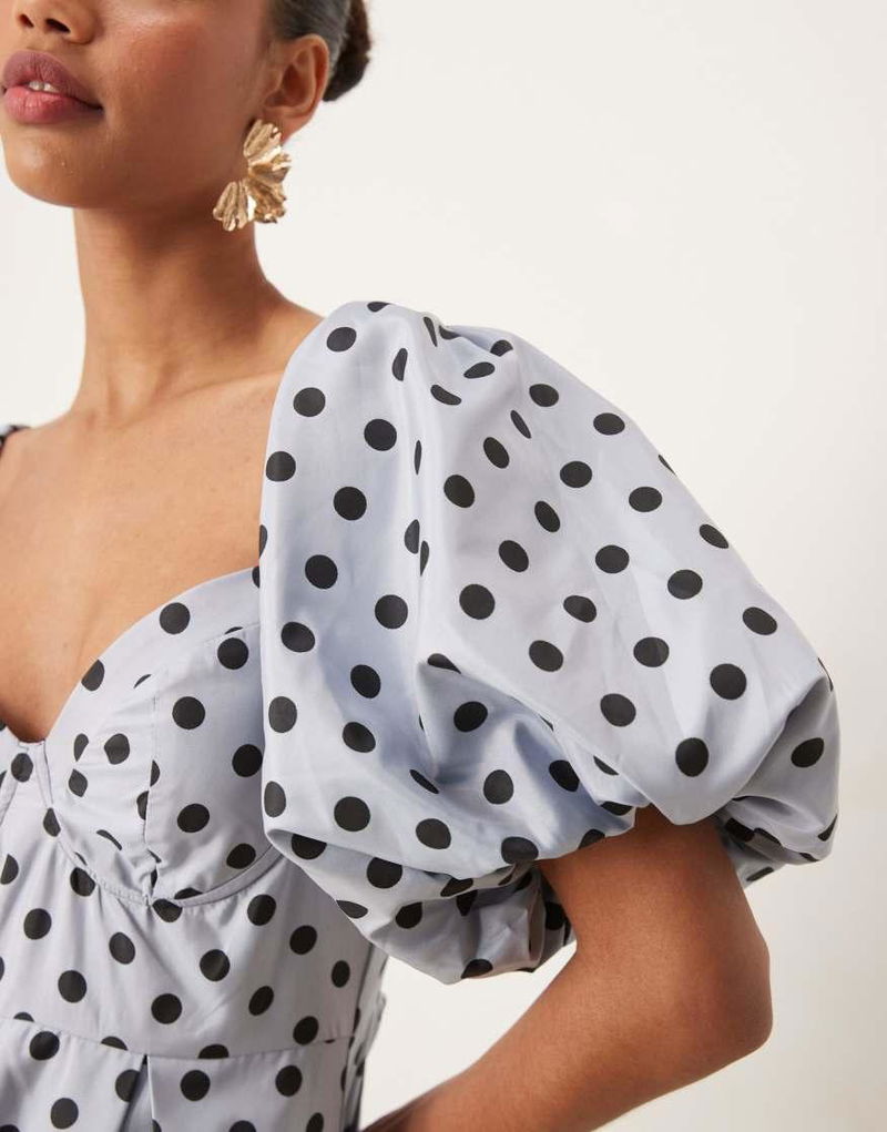 Polka-dot print V-neck Puff sleeves Zip-back fastening Tiered hem Regular fit.