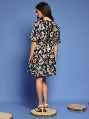 Midi-length dress in a ditsy floral chiffon fabric. Detailed with an elasticated shirred waist and neckline, multi-tiered skirt and asymmetric hem.