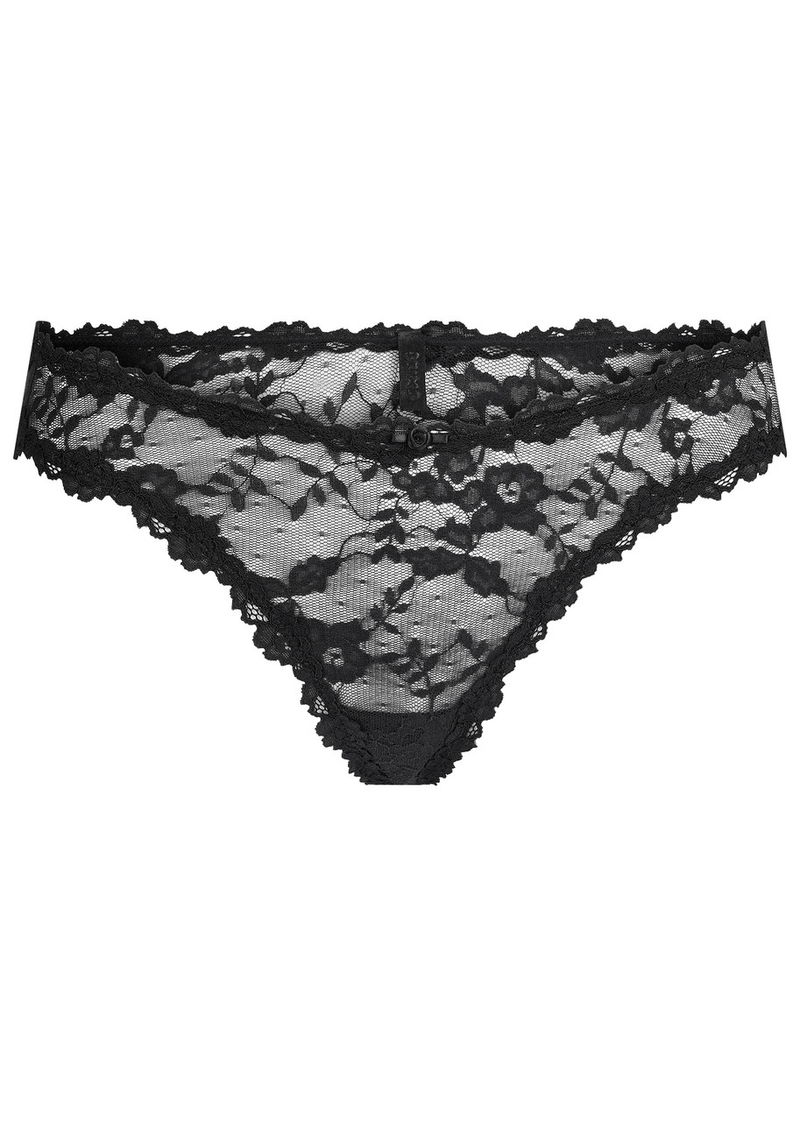 This feminine, sheer lace-adorned dipped front thong is the next addition to your top drawer.