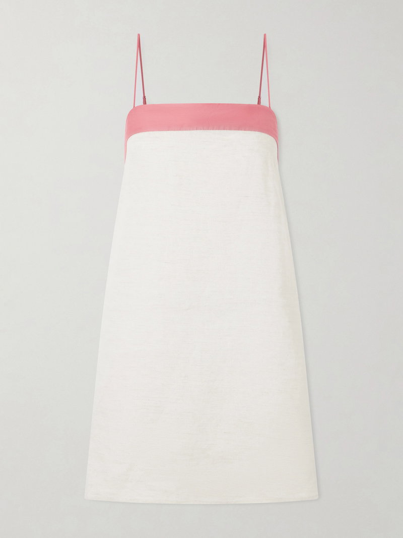 STAUD’s 'Laura' linen mini dress is cut in a clean, straight silhouette with slender straps and a square neckline. The lightweight fabric and subtle pattern lend it an easy, warm-weather feel. Style it with simple sandals or ballet flats for understated polish.