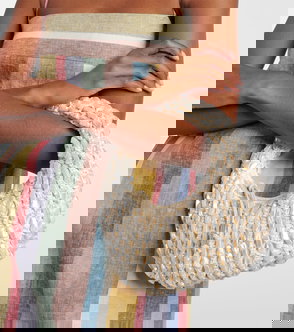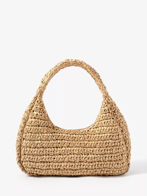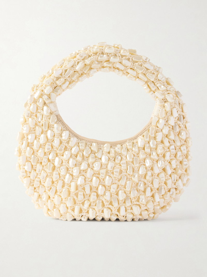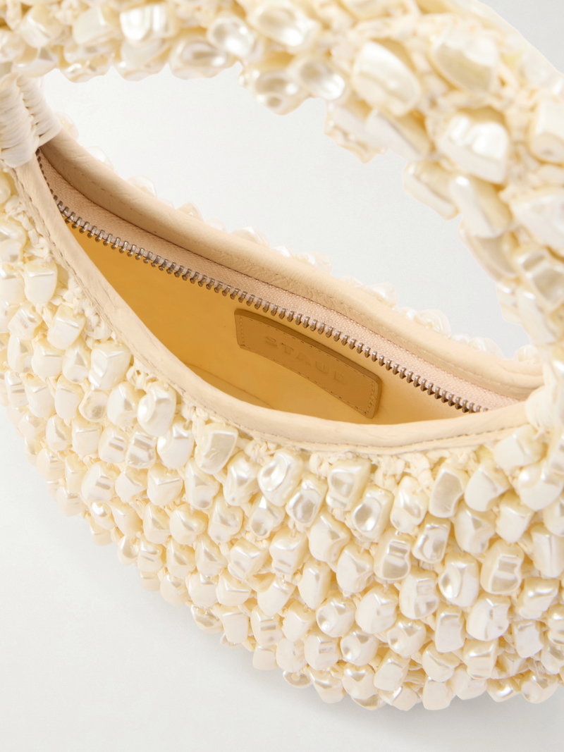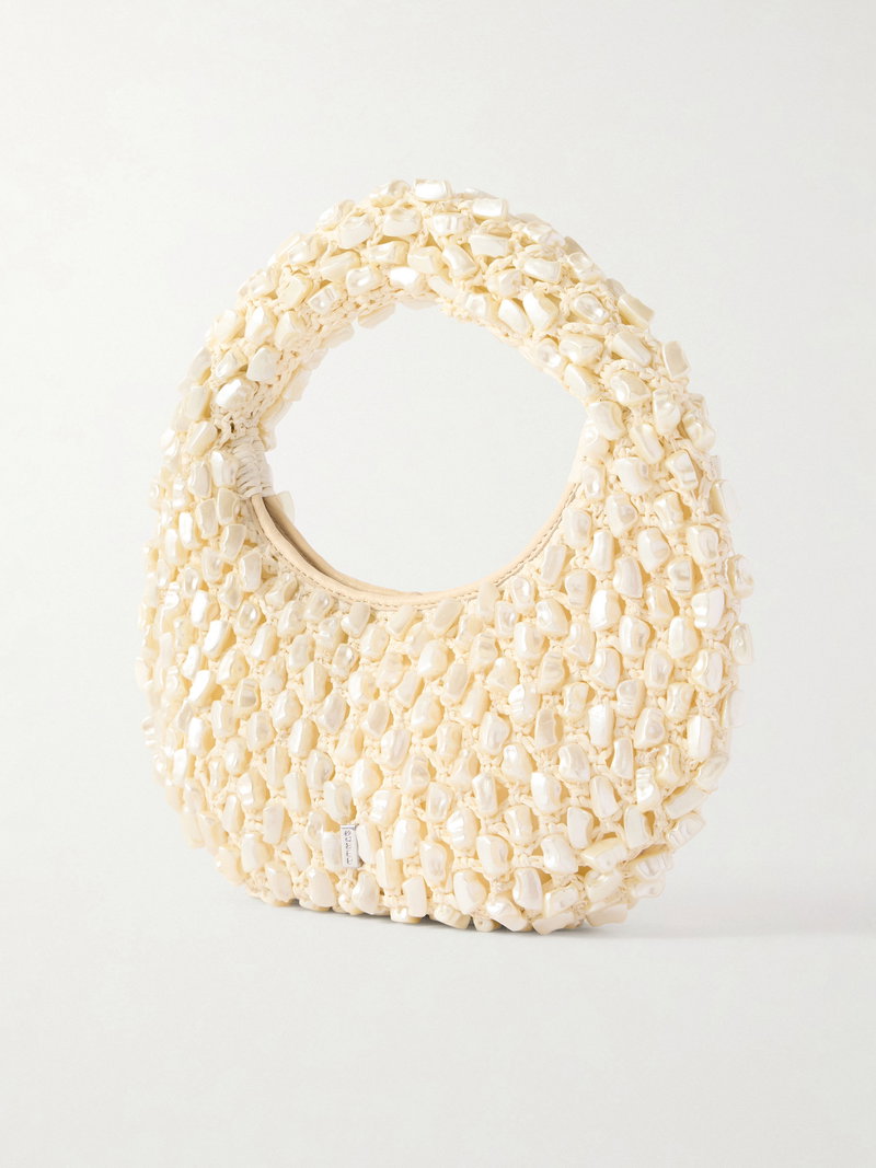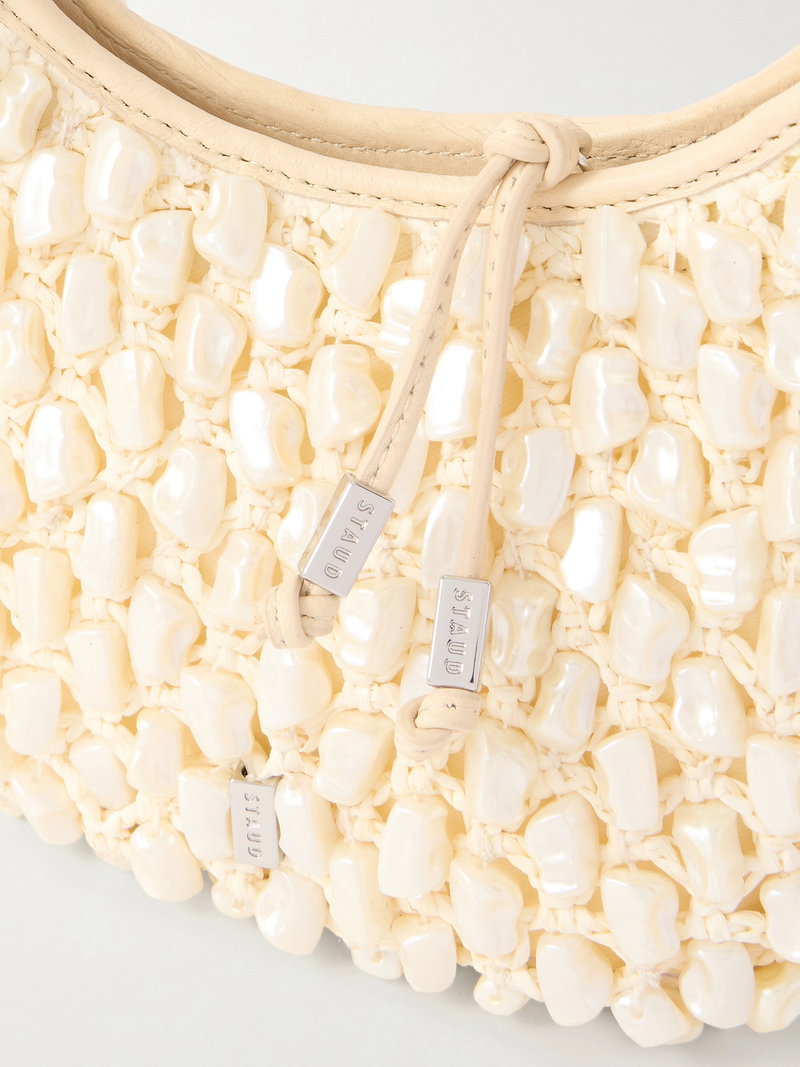 STAUD's 'Reef' bag is designed in a classic half-moon shape adorned with pearl-inspired beads throughout. Crafted from raffia-effect fabric with leather trims, it will easily fit your phone, cardholder, and keys.