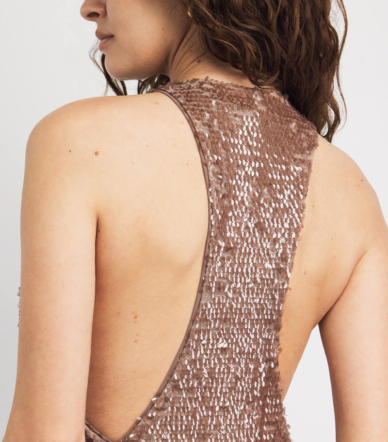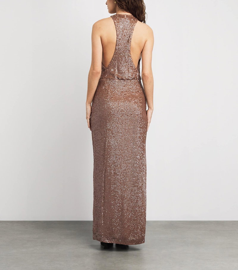 The label’s minimalist approach highlights the superb cut of this sophisticated style with the sequinned sheath emitting effortless glamour.