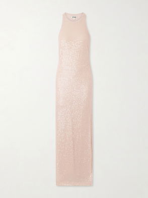staud’s shimmering Bree dress appears to float around the frame, cascading from a halterneck into an ankle-grazing hem for a most elegant finish.