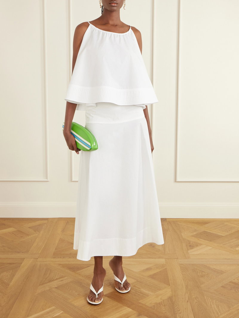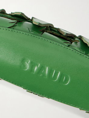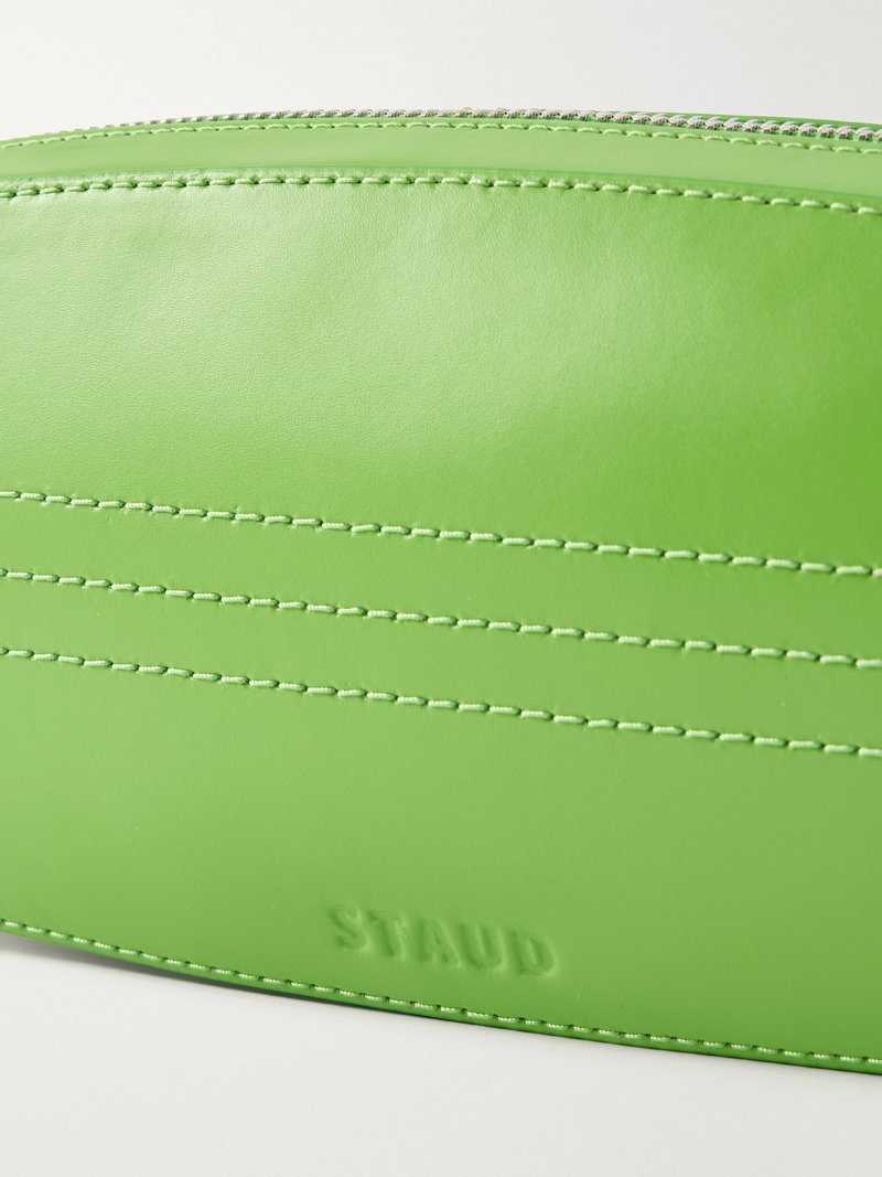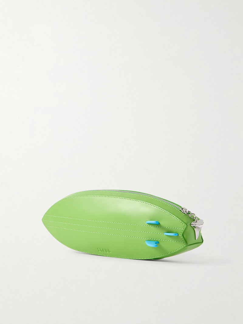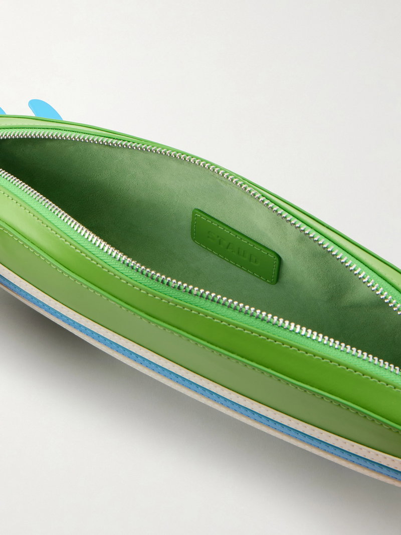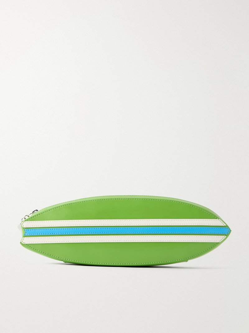 STAUD’s ‘Surfboard’ clutch echoes the clean lines of its namesake. Crafted from smooth leather in a vivid green hue, it’s detailed with contrasting stripes and a shark tooth-inspired zip that lends a playful edge.