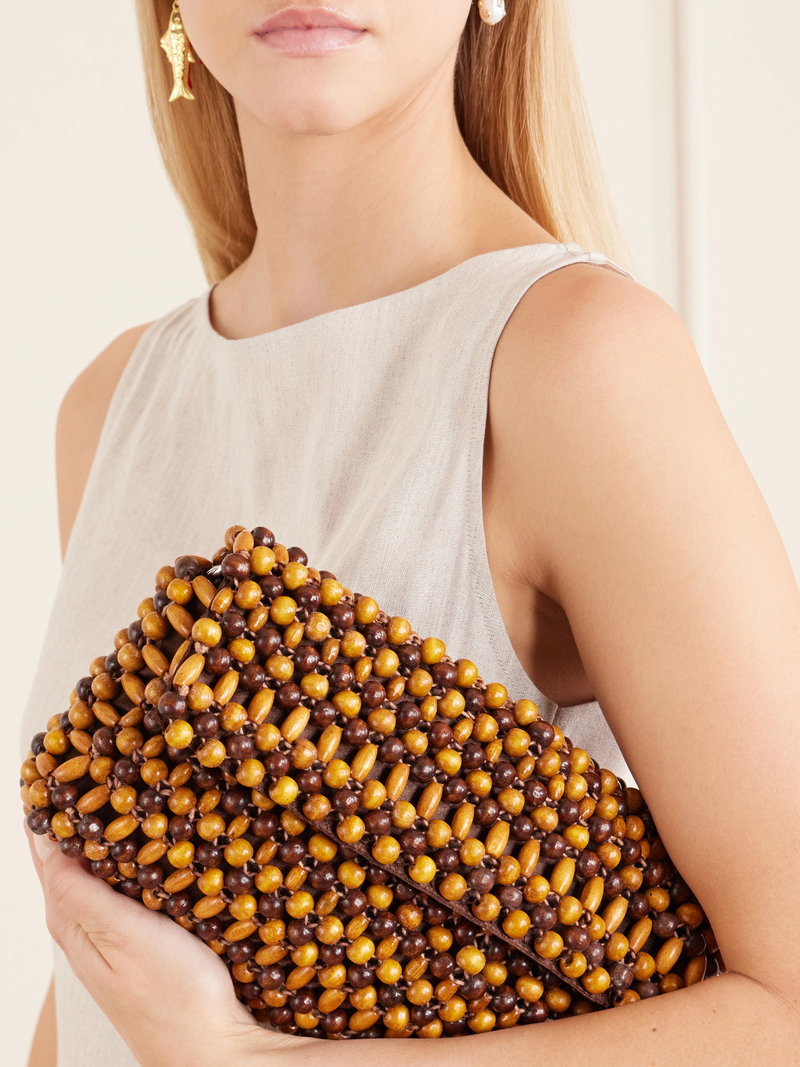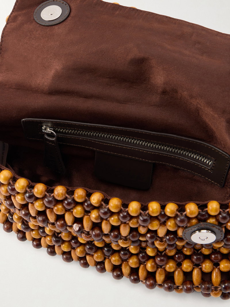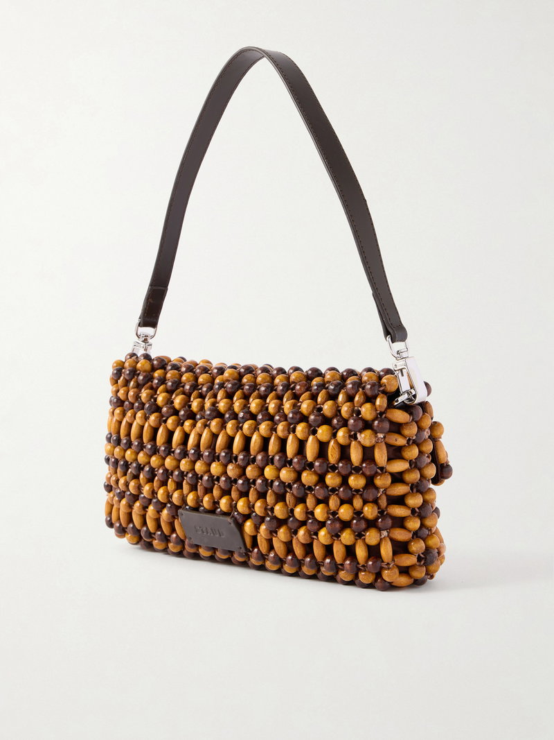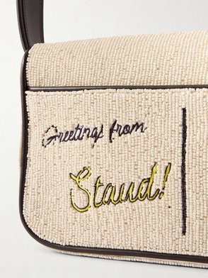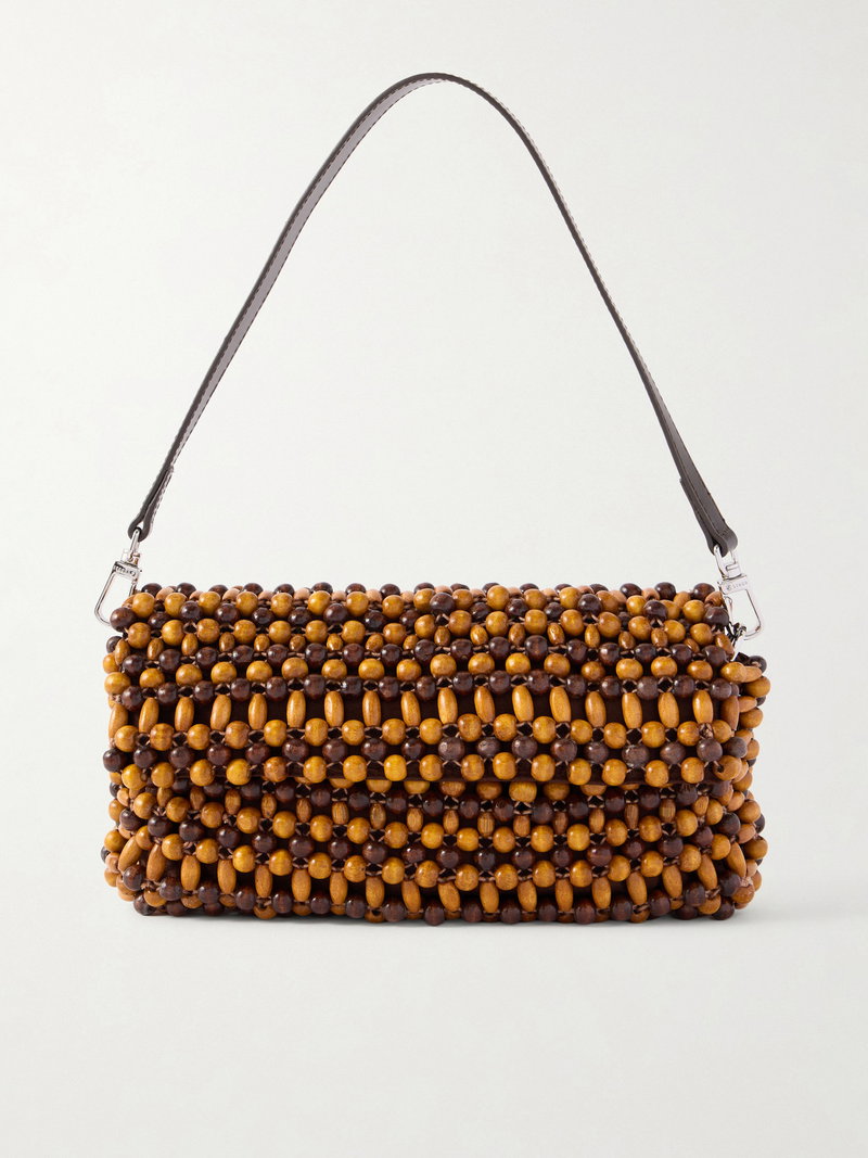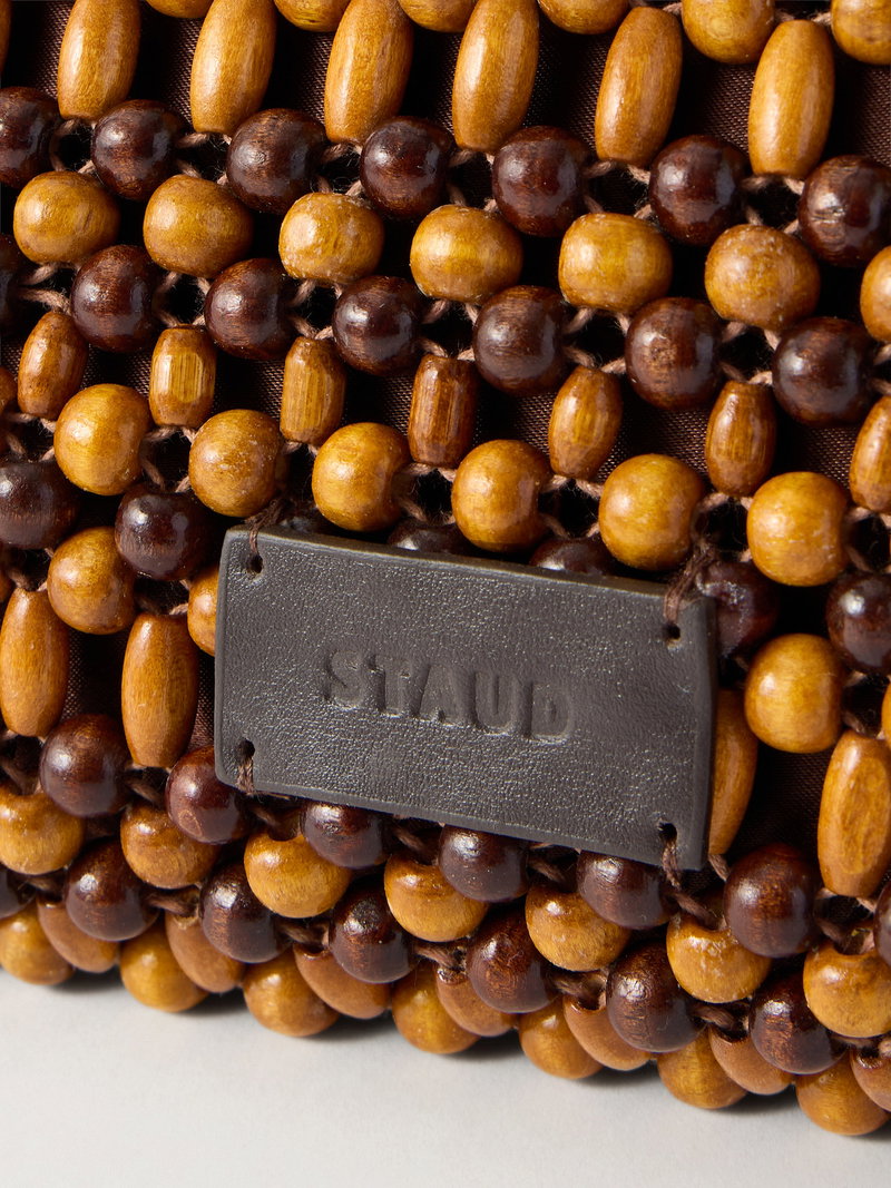 STAUD's 'Timmy' bag showcases artistry through detailed wooden beadwork. Crafted from leather, it has a flap closure with snap buttons and is spacious enough to fit your phone, wallet, and keys.
