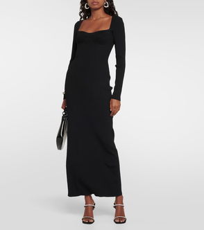 Asymmetric lines have long been a staud signature, illustrating a love affair with avant-garde detailing and unconventional silhouettes. The long-sleeve Craftsman dress offers a softened take on the hallmark, defined by an off-the-shoulder neckline, mother-of-pearl buttons and a soft ribbed knit.