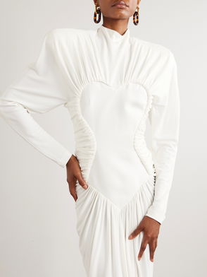 Stella McCartney's showstopping gown comes in a striking red hue and is lined with crystals along the plunging tulle-panelled neckline. Crafted from crepe, it features a cape-effect design that flows effortlessly into the sleeves for a seamless look.