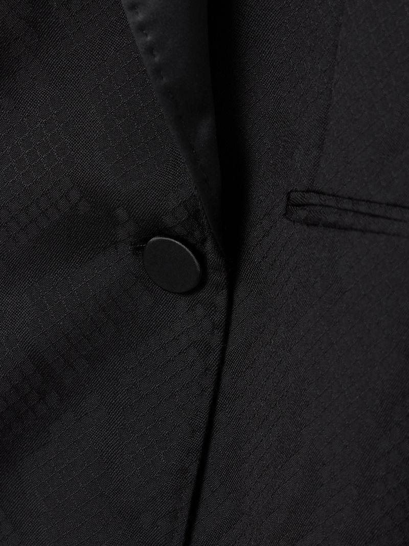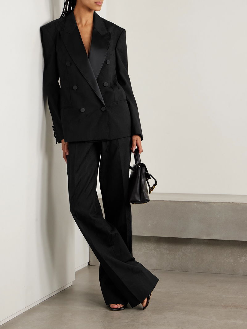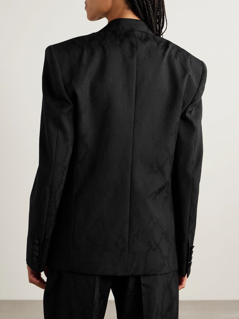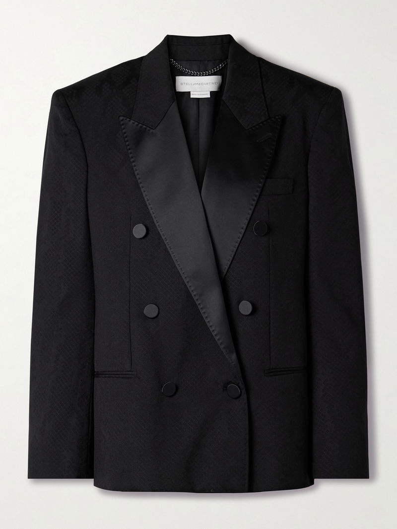Stella McCartney's blazer is tailored for a boxy, oversized fit with a smart double-breasted front. It's cut from smooth black wool and has tonal satin trims recalling traditional tuxedo styles. Padded shoulders add structure.
