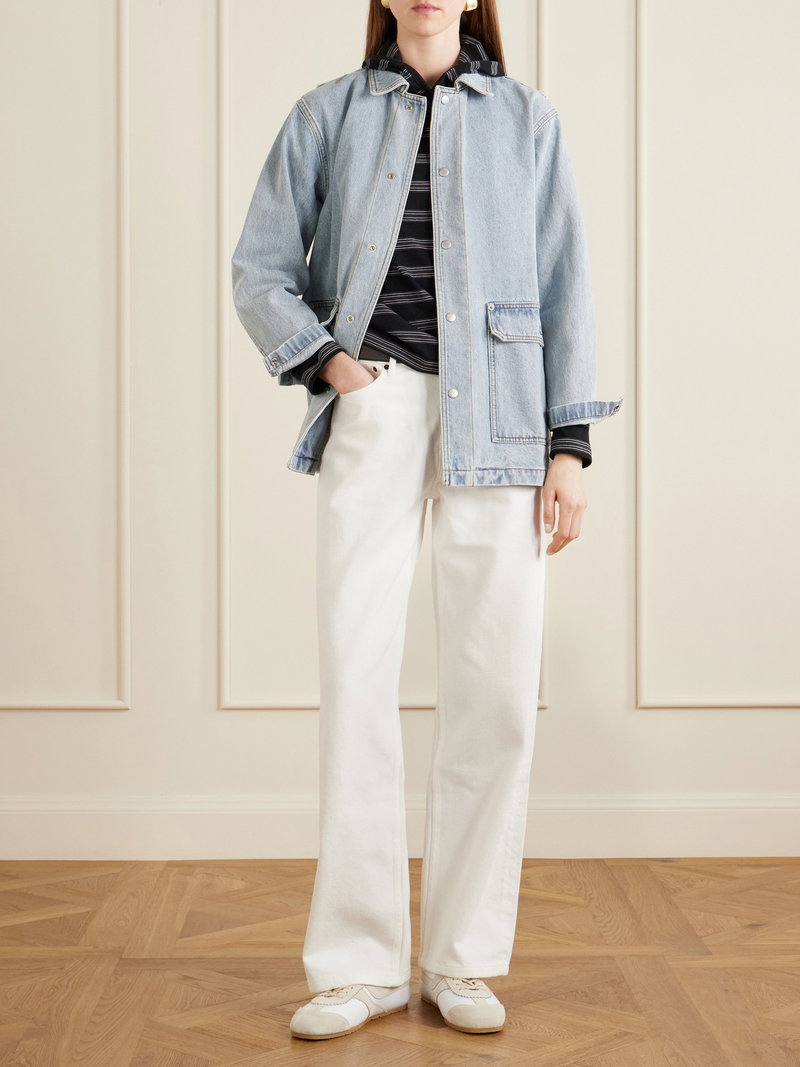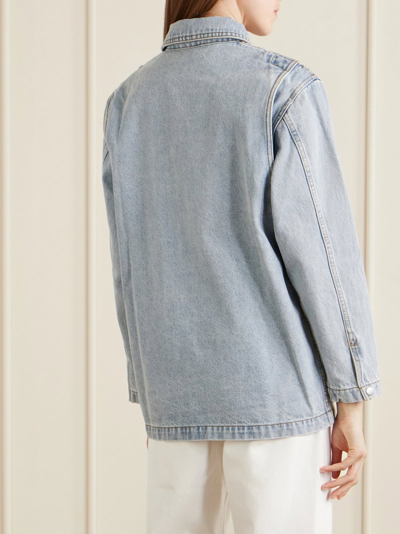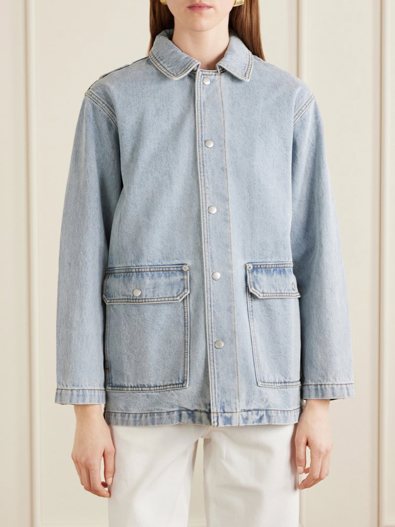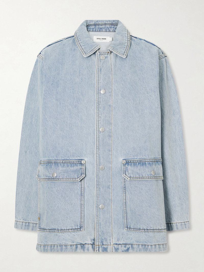 Still Here’s ‘Barn’ jacket nods to classic workwear styles. Made from faded denim for a lived-in look, it has a relaxed shape, framed by a neat collar and large patch pockets.