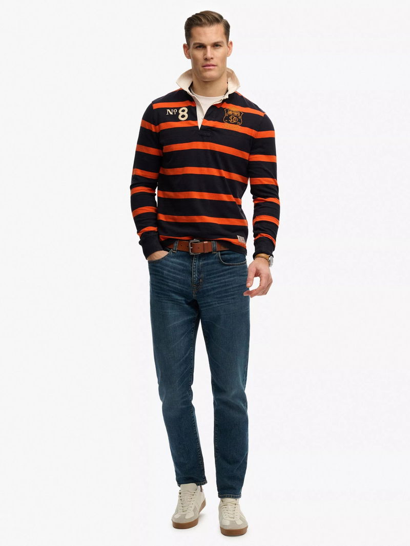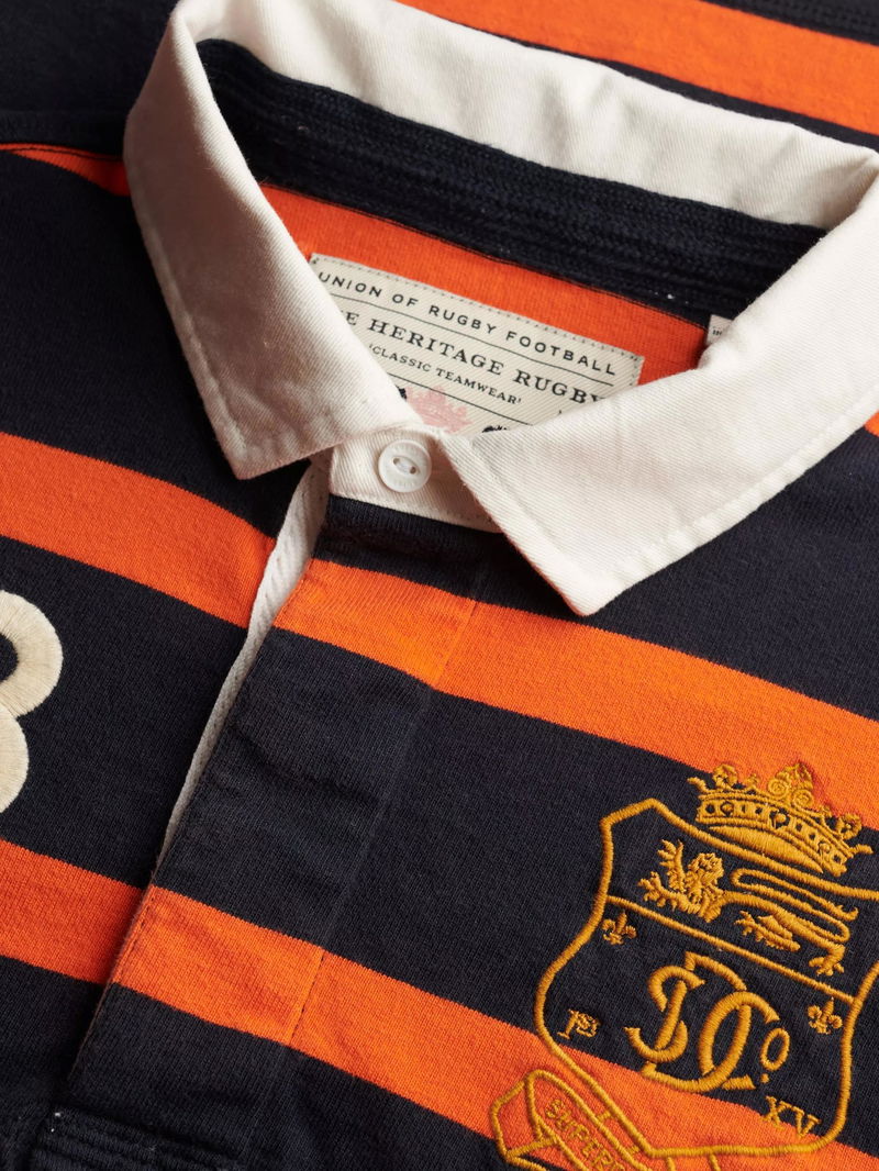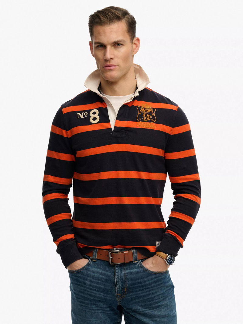 Cotton Regular Fit Double Emblem Stripe Rugby Shirt, Navy/Orange Stripe