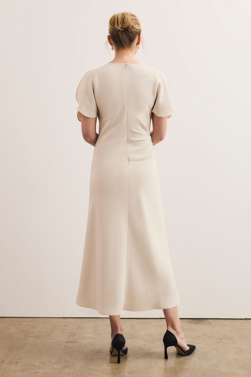 Crafted from flattering Clever Crepe Doppio, this iteration of our bestselling Salerno dress is subtly textured. It features our signature gathered waistband, a slash neck and curved sleeves that fall open like flower petals. Straight in its silhouette, it’s the ultimate in elegant event-ready style.