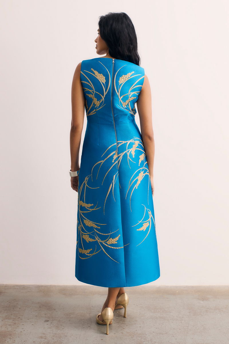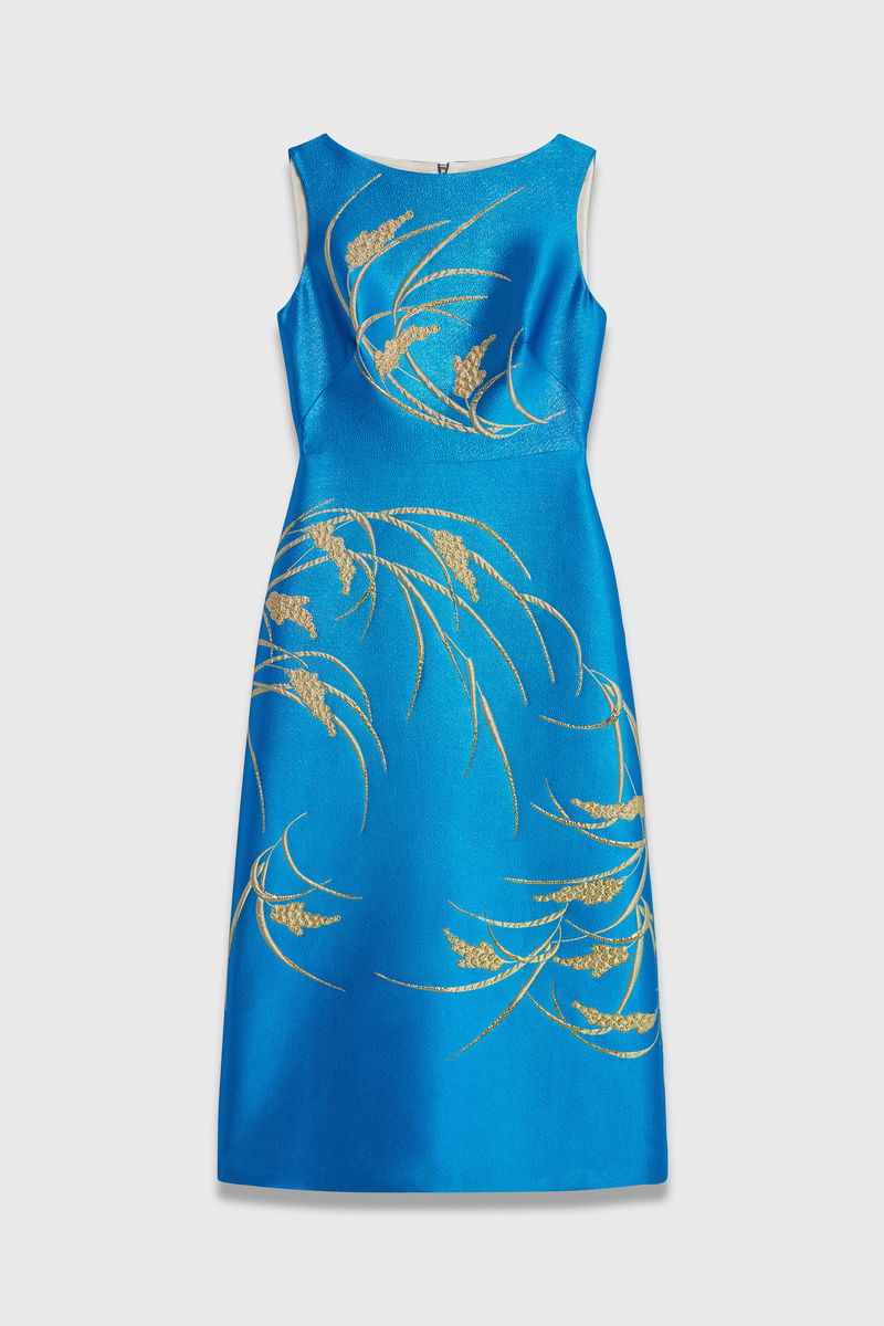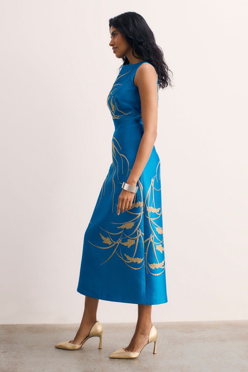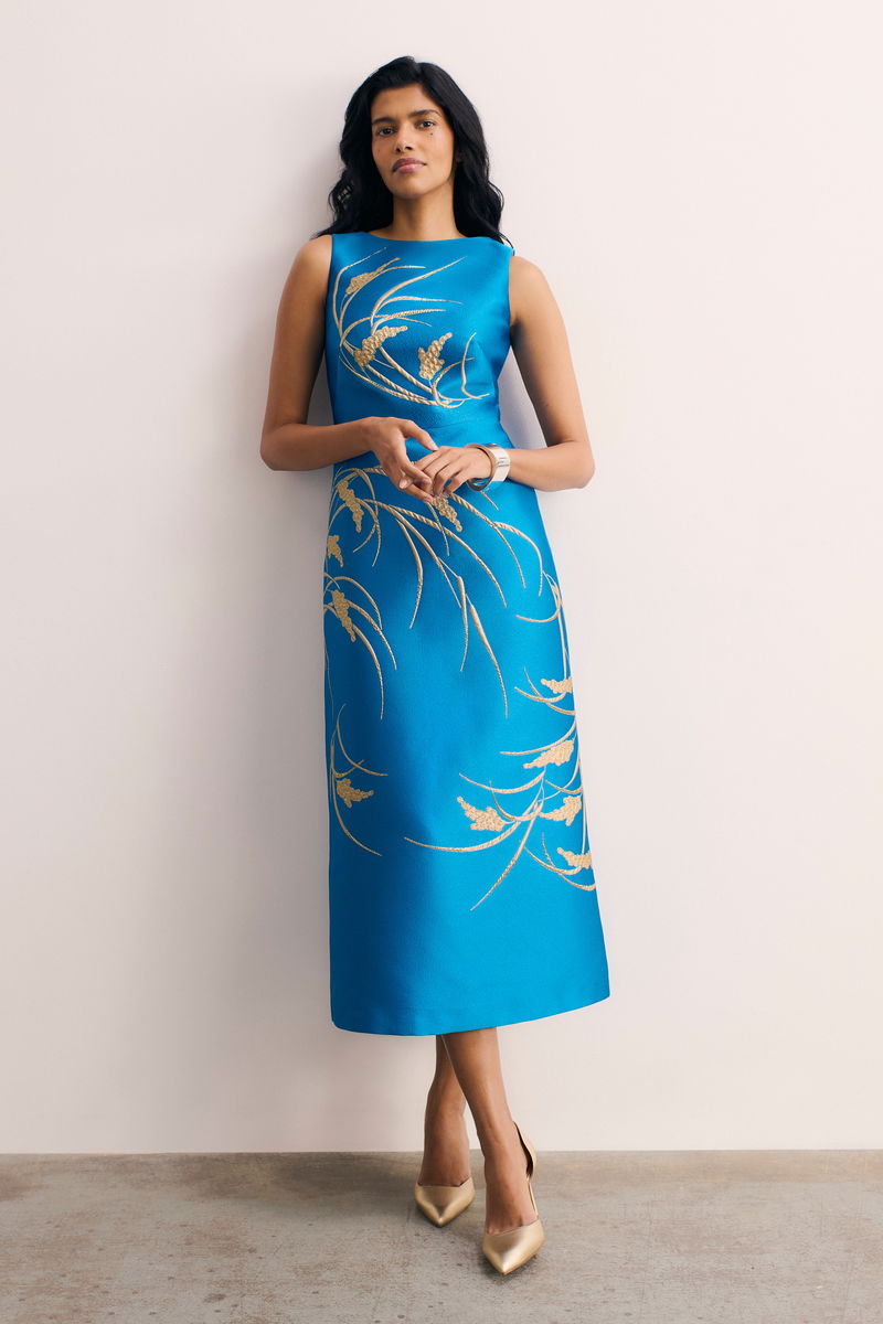 Crafted from beautiful Italian fabric, the oyster and gold botanical jacquard that details the Eden dress has been skilfully placed for the most flattering finish. As for its silhouette, its slash neckline and column skirt are truly timeless.