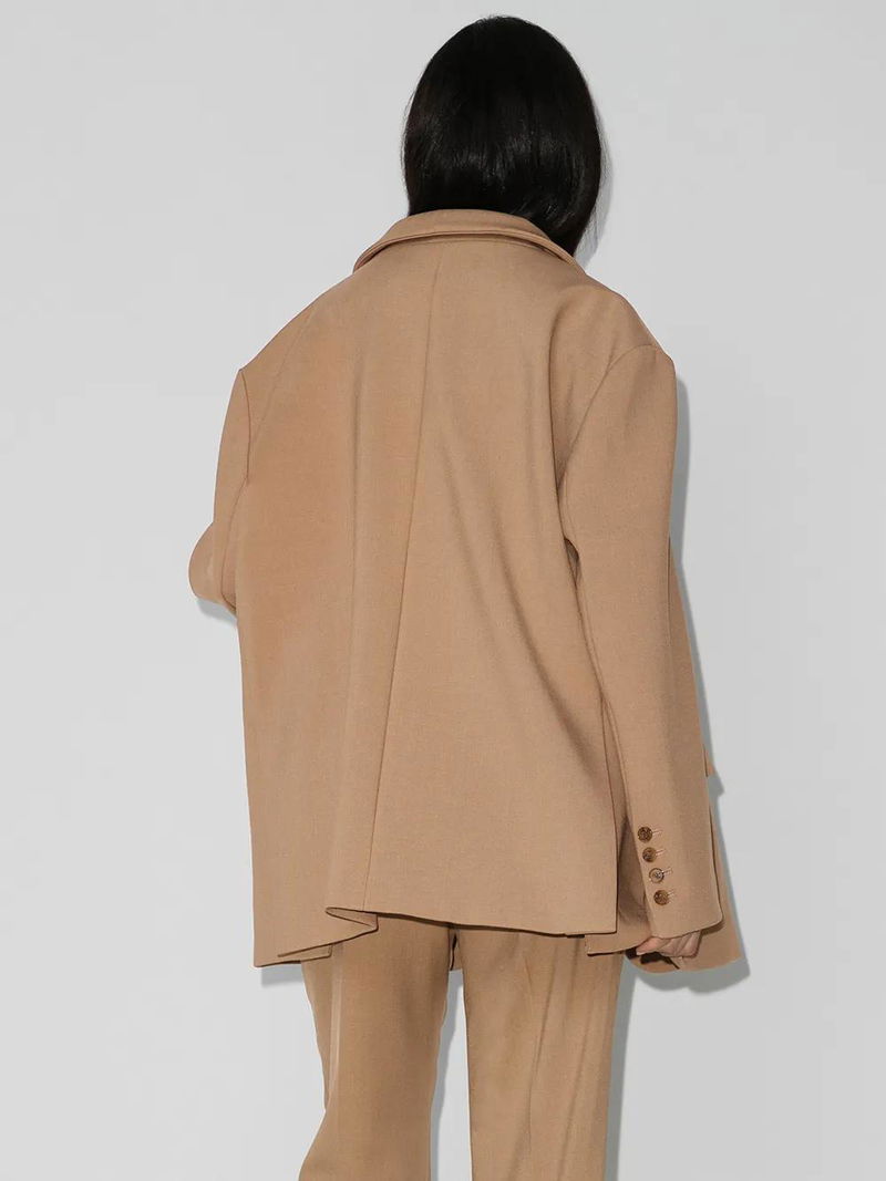 Latte neutral. Made from suiting fabric. Peak lapels. Button front fastening. Drop shoulders. Long sleeves with buttoned cuffs.