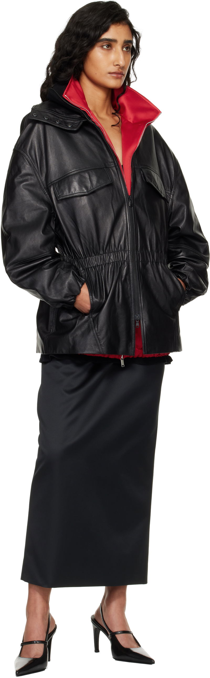 Grained lambskin jacket. Layered rib-knit stand collar. Two-way zip closure. Flap pockets at chest. Elasticized waist and cuffs. Seam pockets at waist.