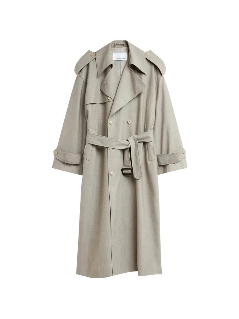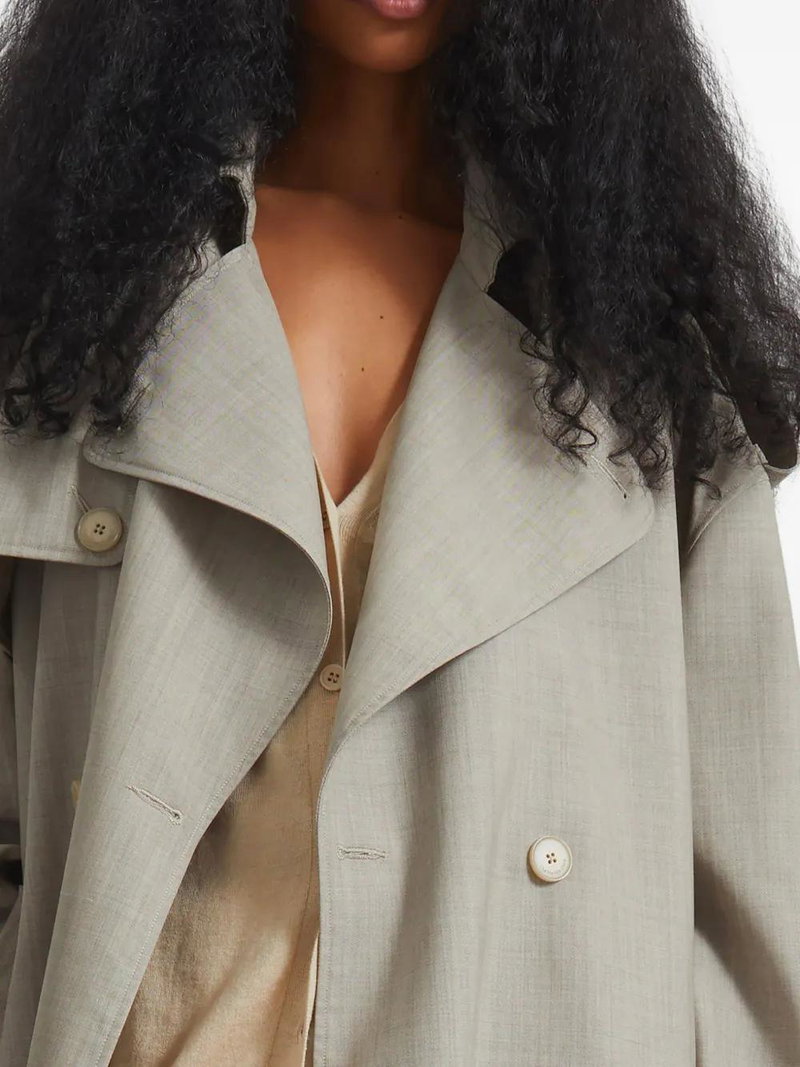 Beige double-breasted button fastening belt long sleeves shoulder epaulettes.