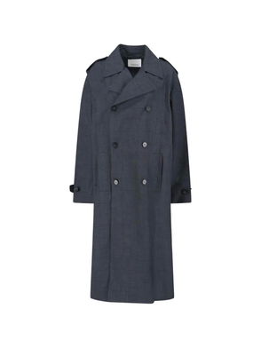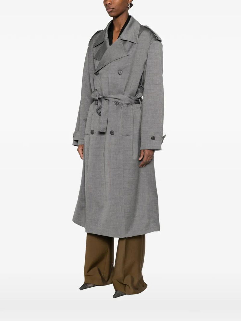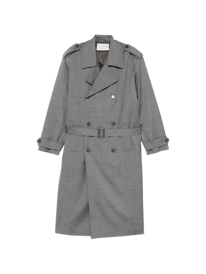 Grey, double-breasted, button fastening, belted waist.
