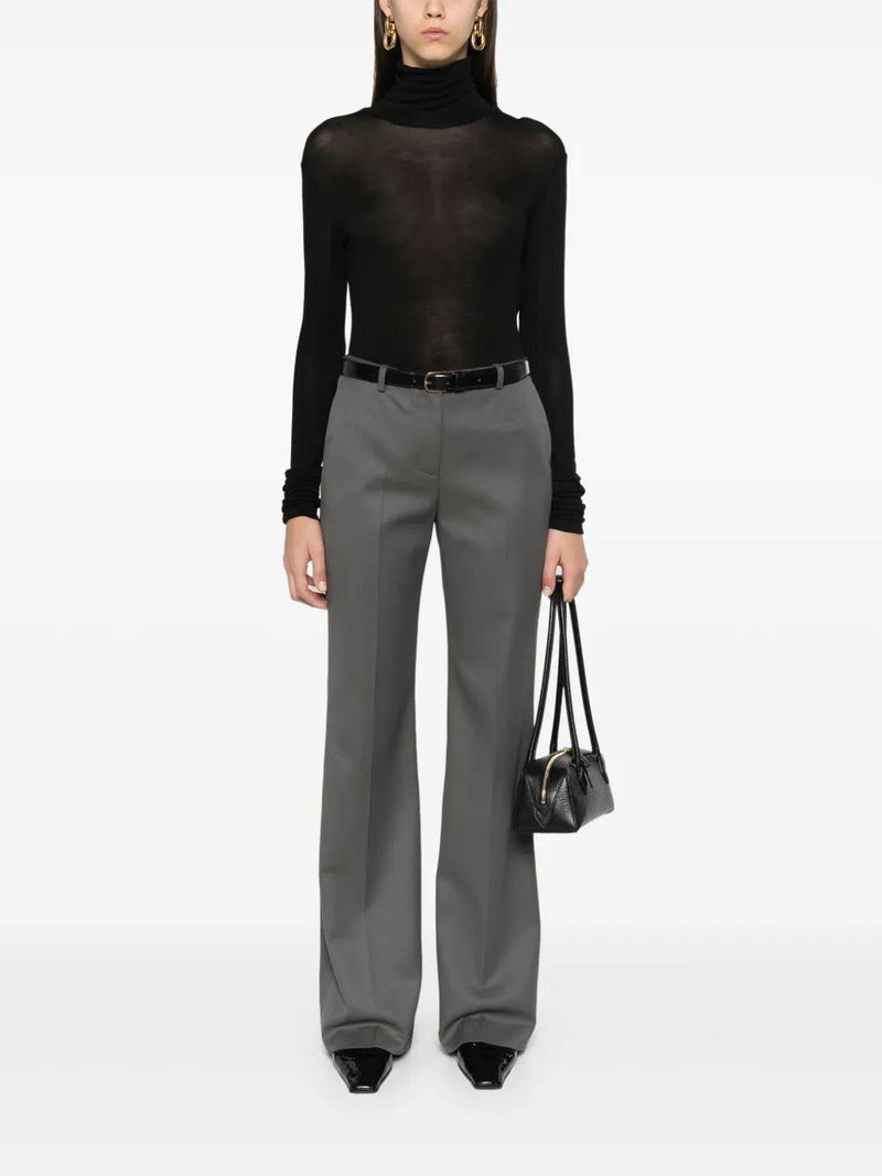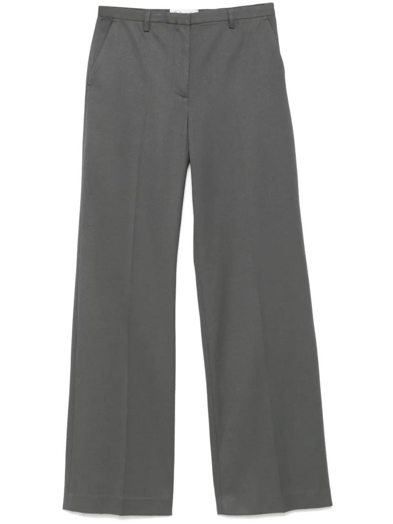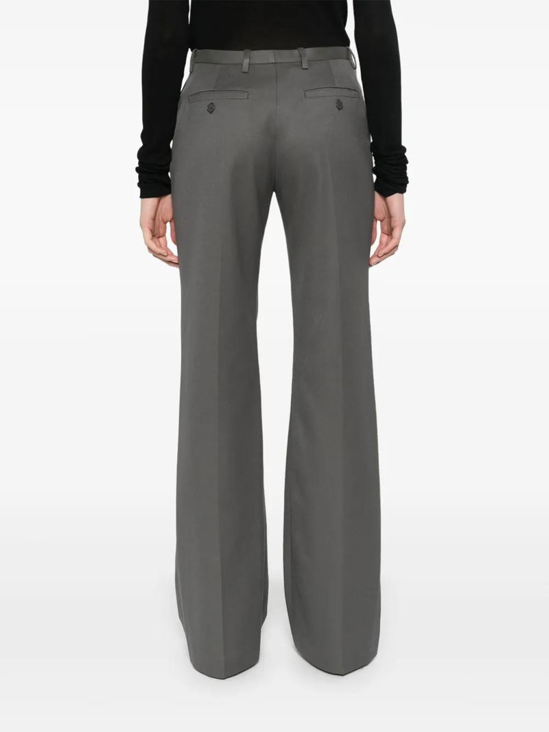 Twill weave, concealed front button, hook and zip fastening, belt loops, pressed crease, two diagonal pockets to the sides, two rear button-fastening pockets, flared design.