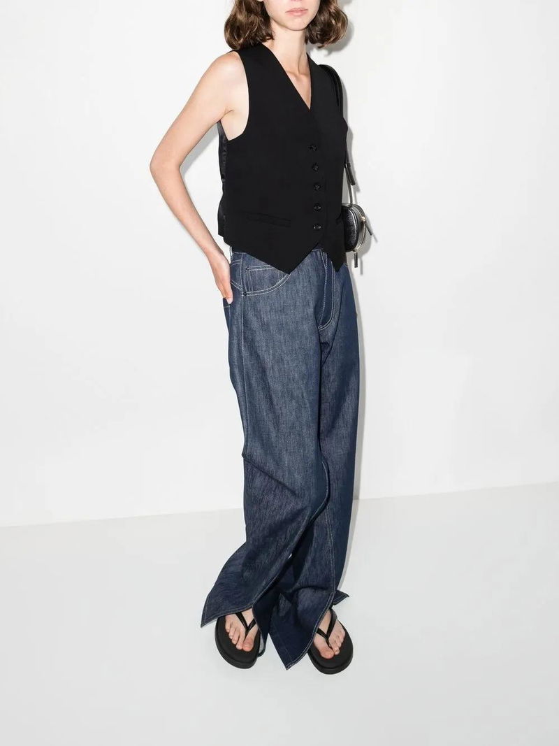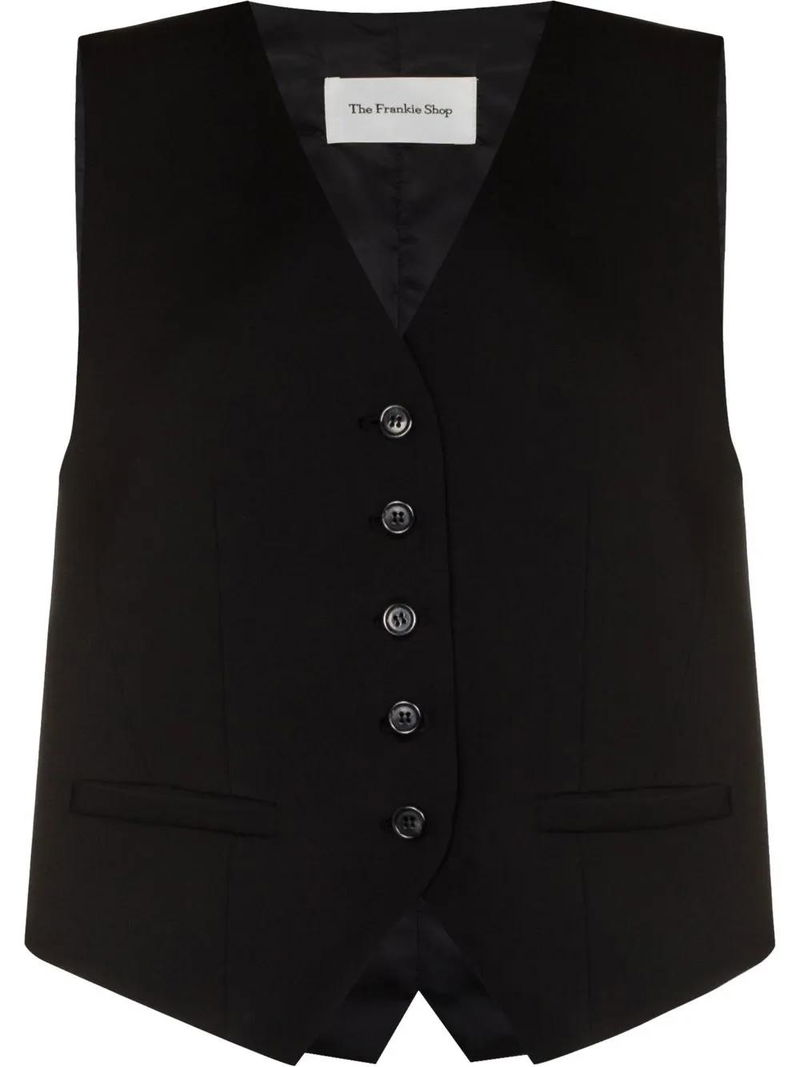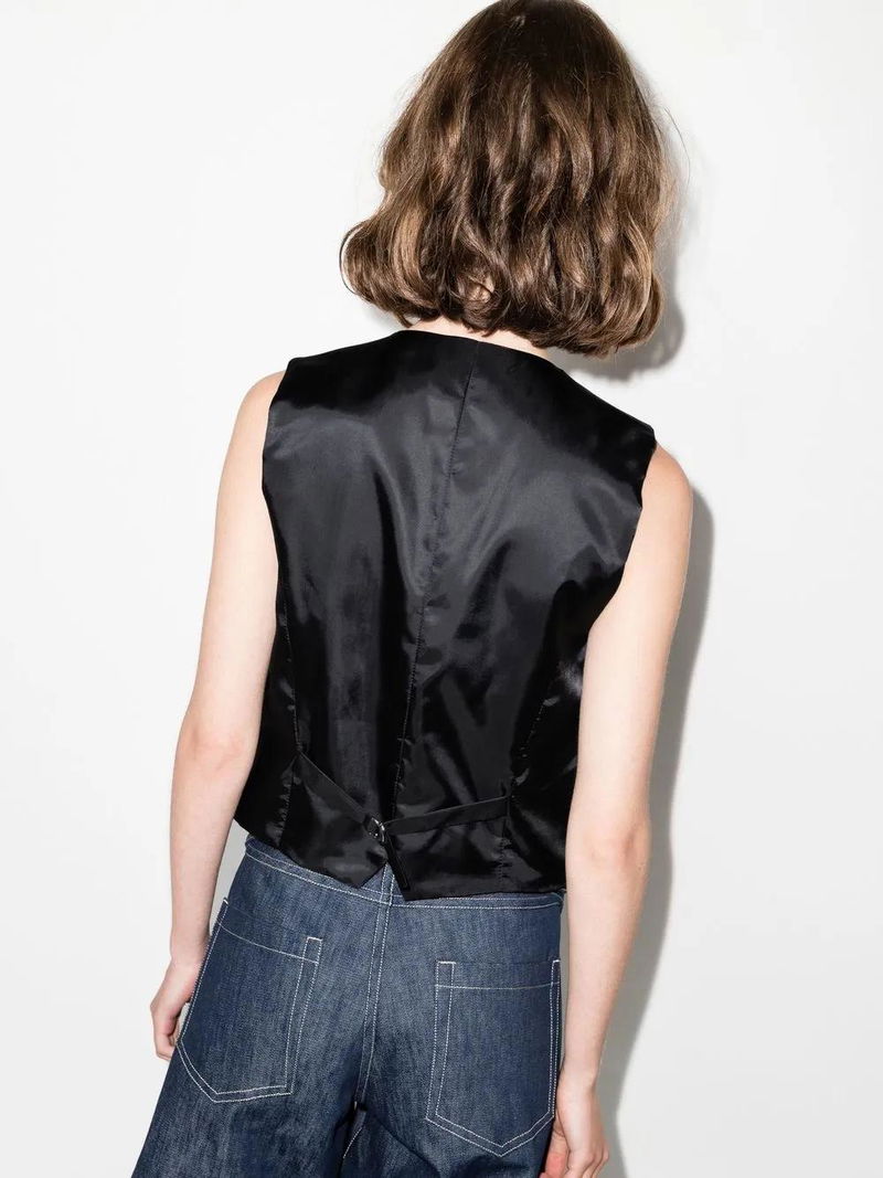 Black V-neck sleeveless front button fastening two front welt pockets adjustable strap to the rear.