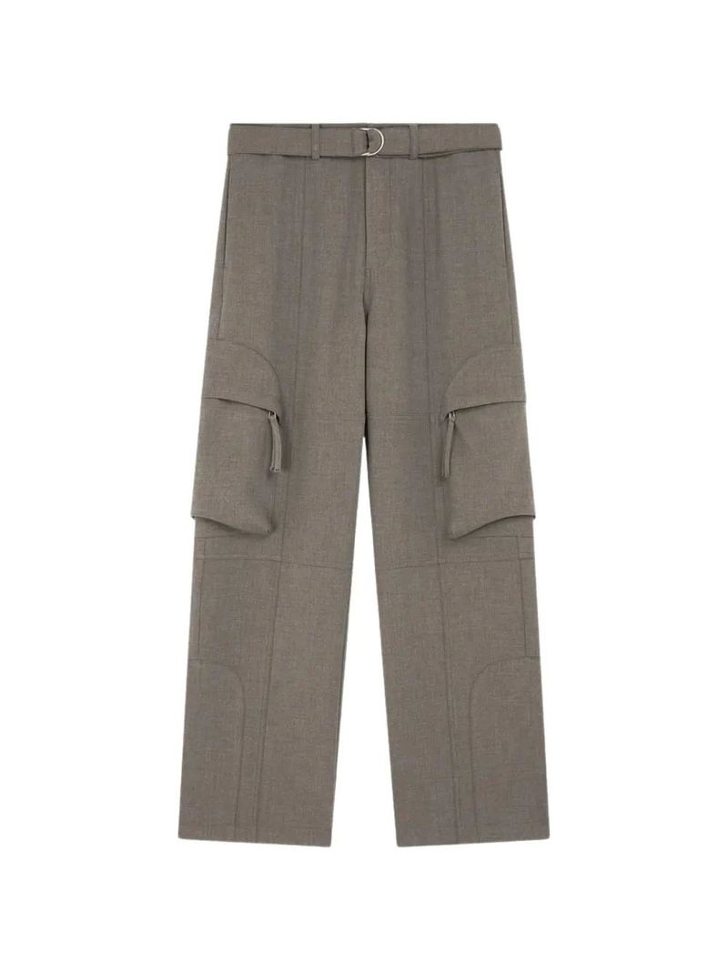 Grey, belt, side flap pockets, panelled design.