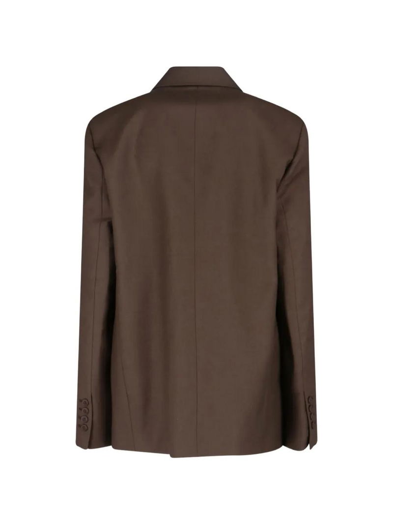 Brown, double-breasted, button detailing, lapel collar, flap pockets, long sleeves.