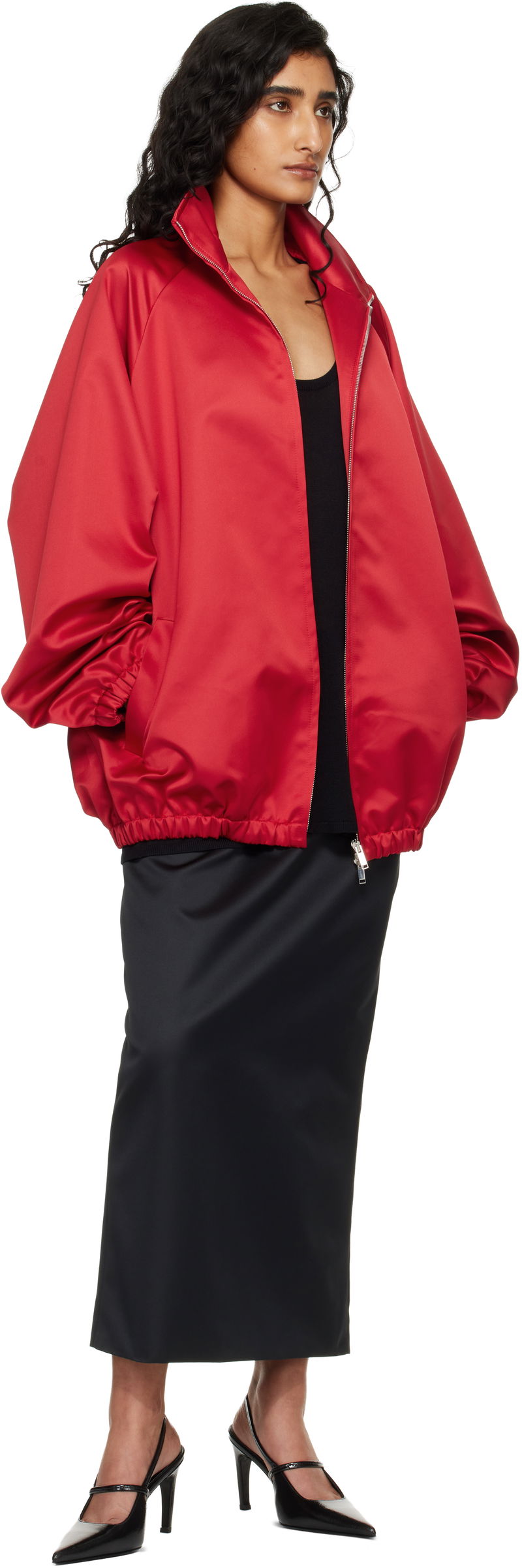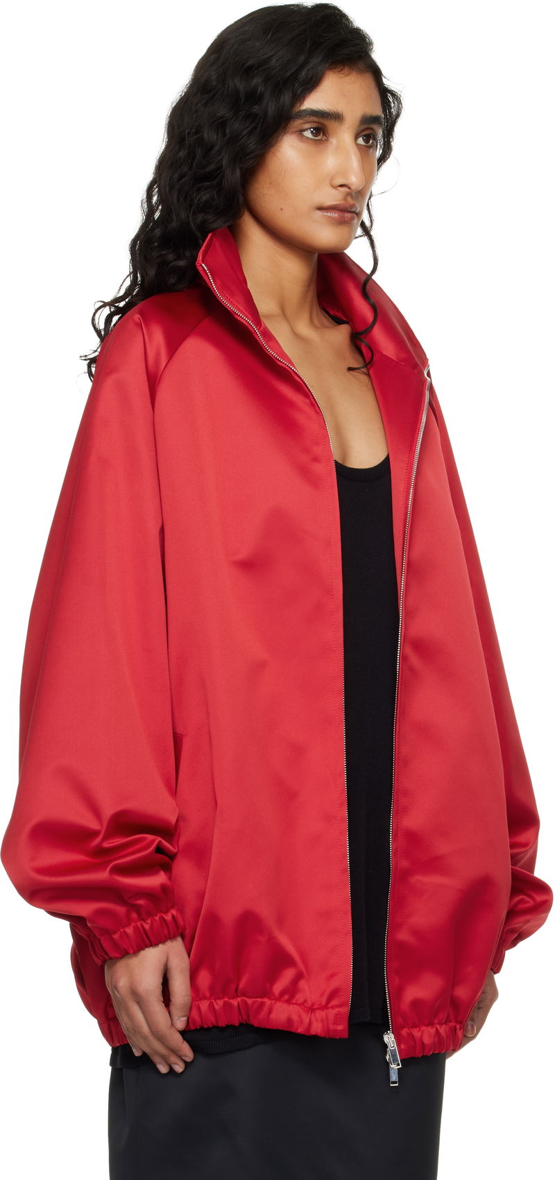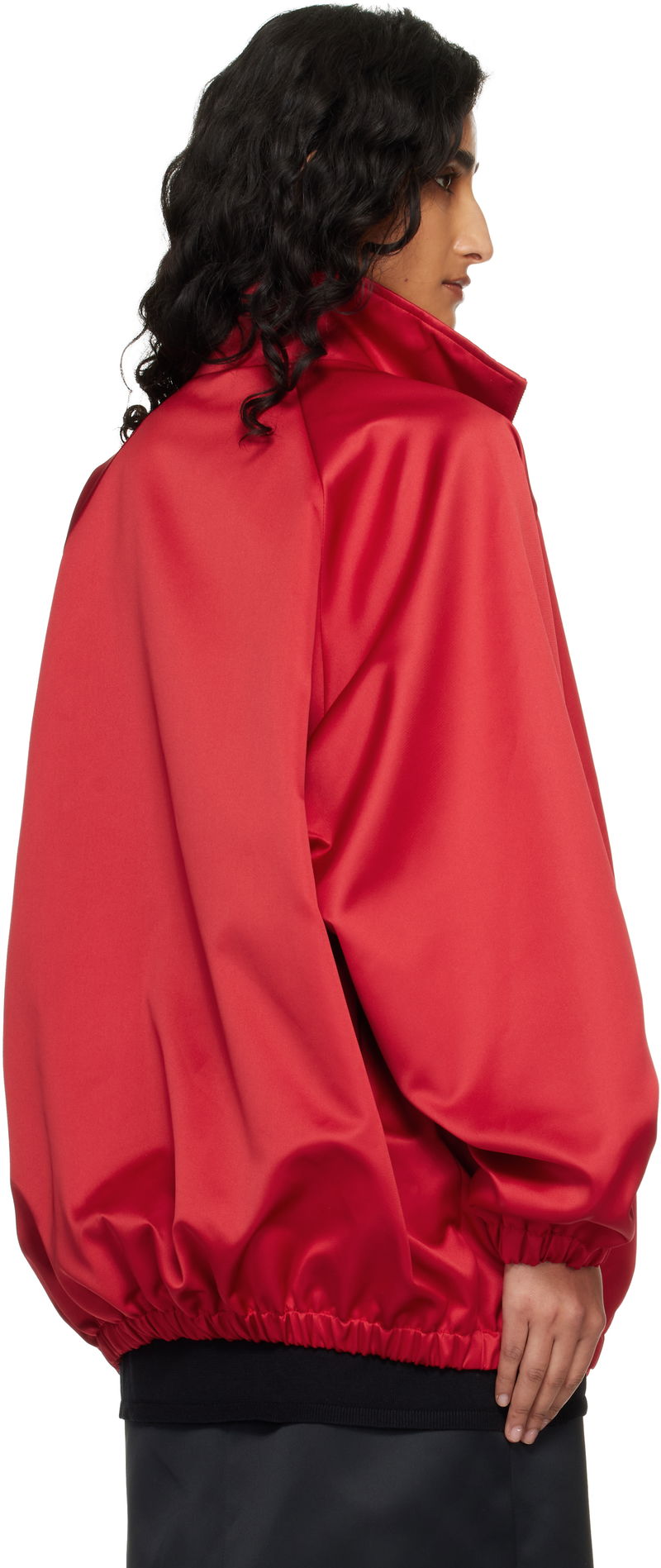 Satin jacket. Stand collar. Two-way zip closure. Welt pockets at front. Elasticized hem and cuffs. Raglan sleeves. Fully lined.