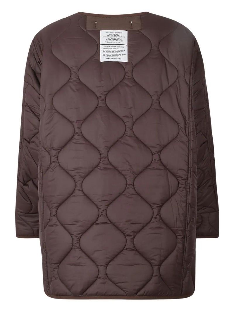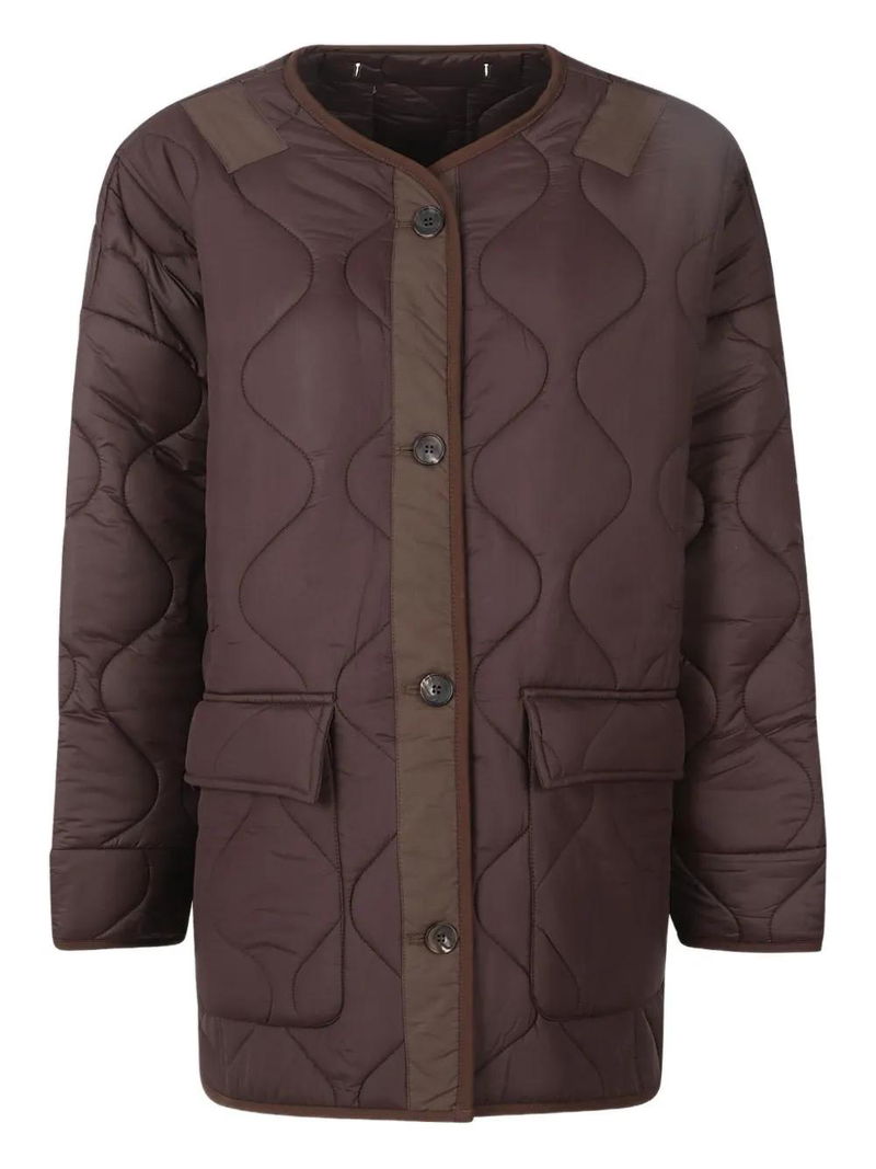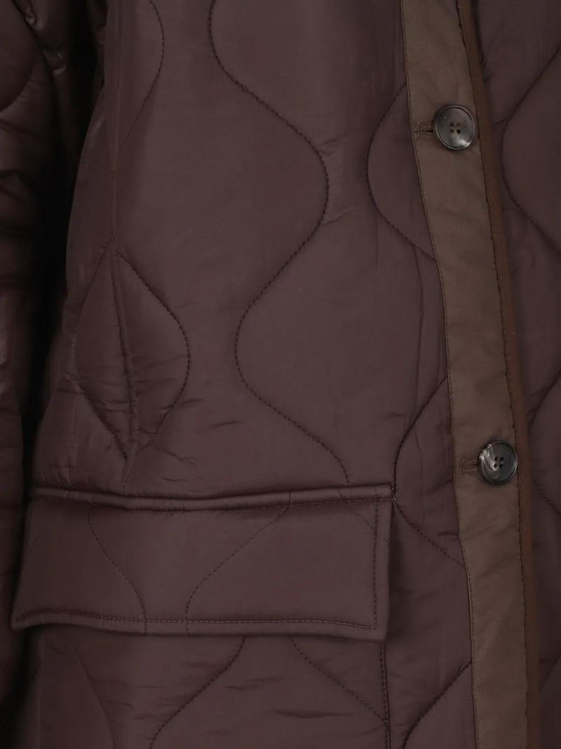 Brown quilted button fastening two front patch pockets contrast trims round neck.