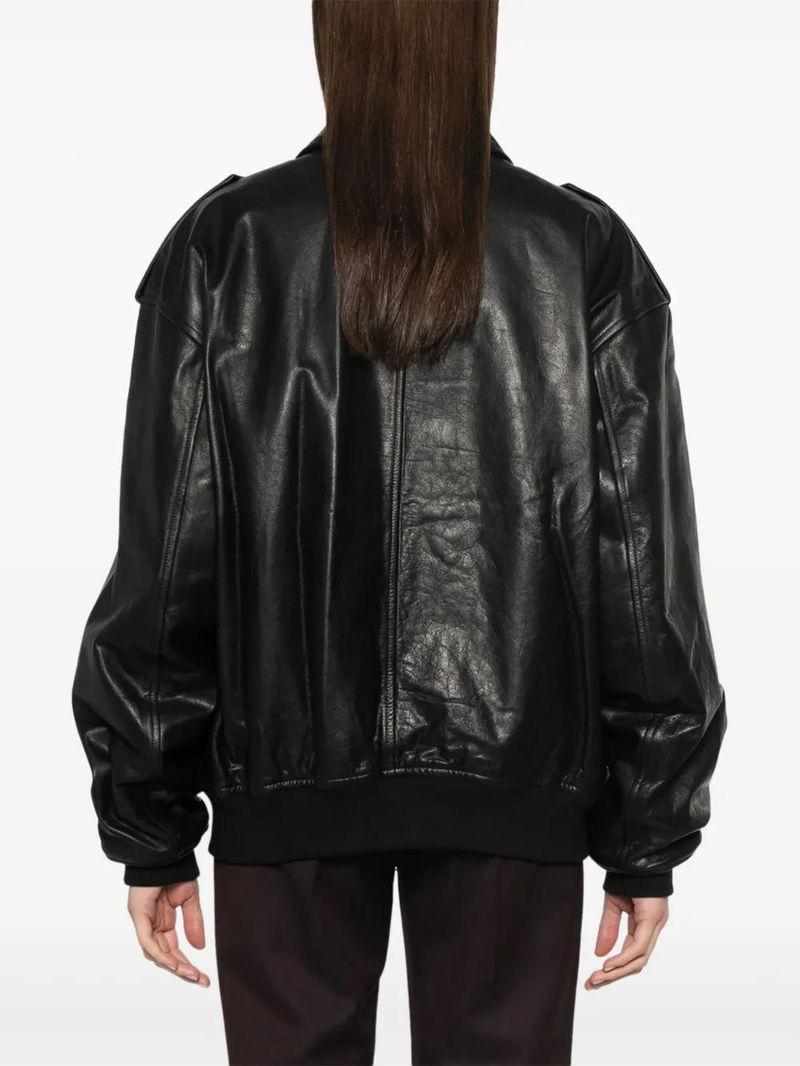 Black calf leather, front two-way zip fastening, classic collar, drop shoulder epaulettes, long sleeves, ribbed cuffs, two front flap pockets, ribbed hem, full lining.