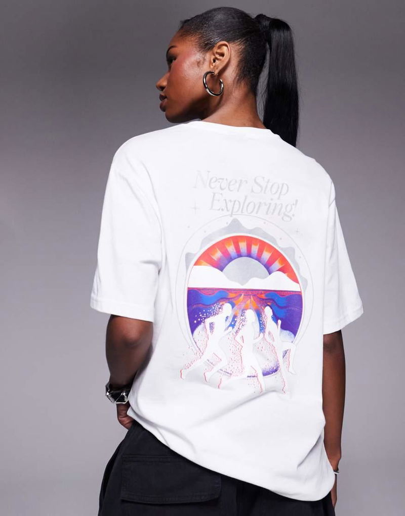 Never Stop unisex backprint t-shirt in white. Crew neck. Drop shoulders. Logo print to chest. Branded graphic to back. Regular fit. Unisex style.