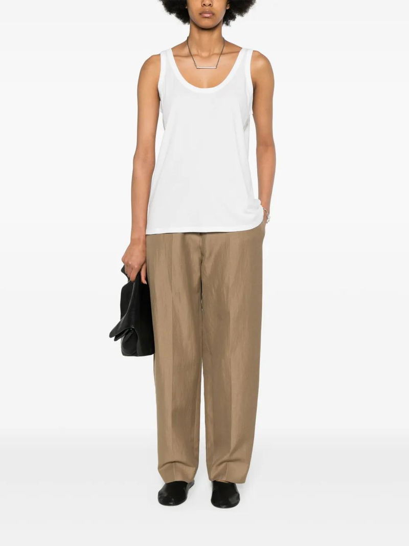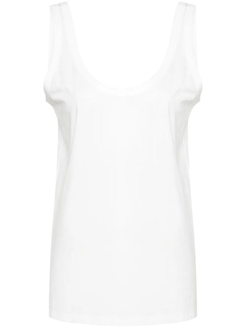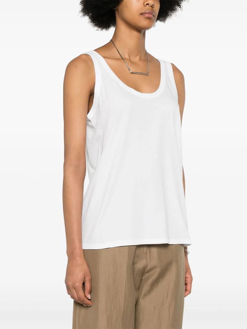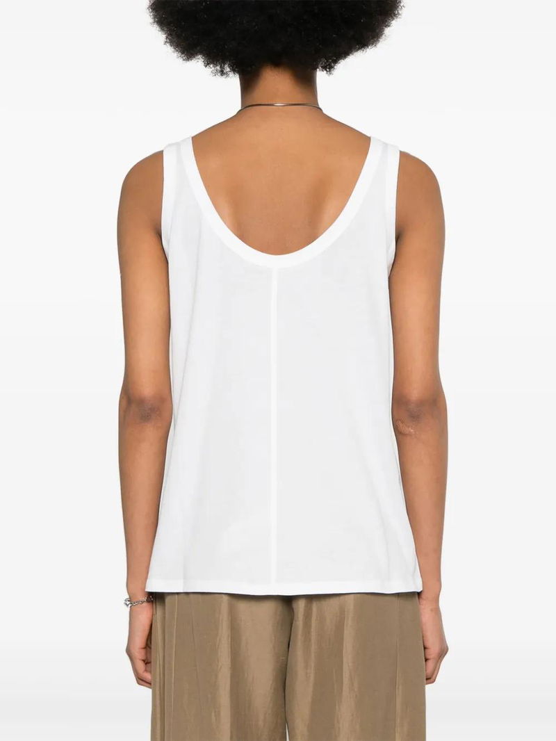 White cotton jersey texture scoop neck thin straps sleeveless scoop back straight hem.