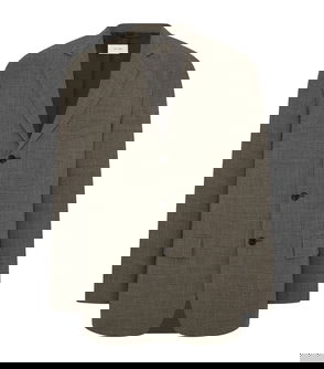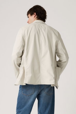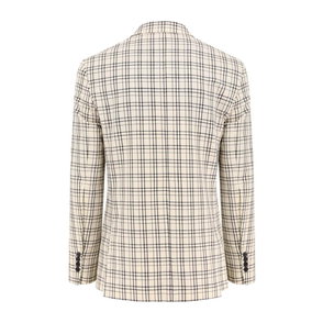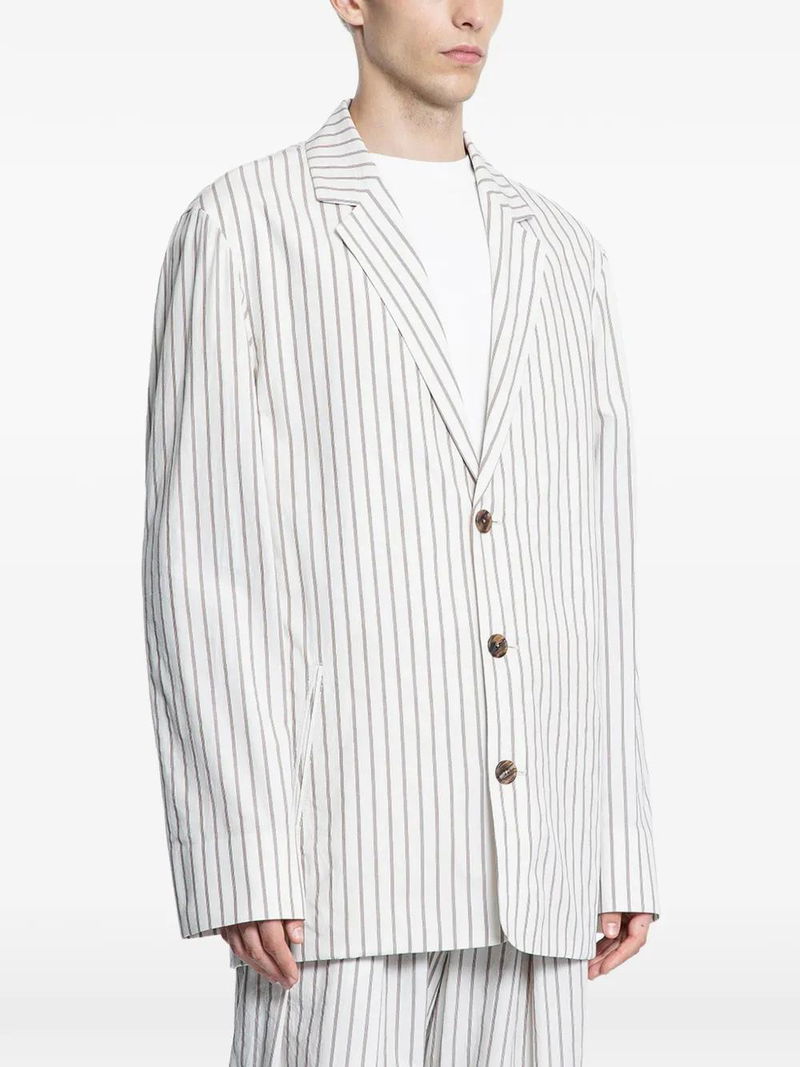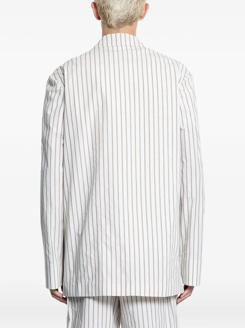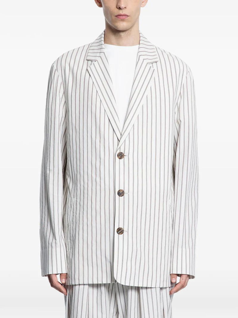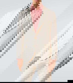 Beige, cotton, striped, button fastening, notched lapels, long sleeves.