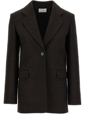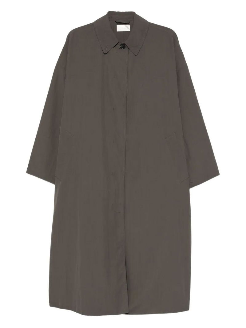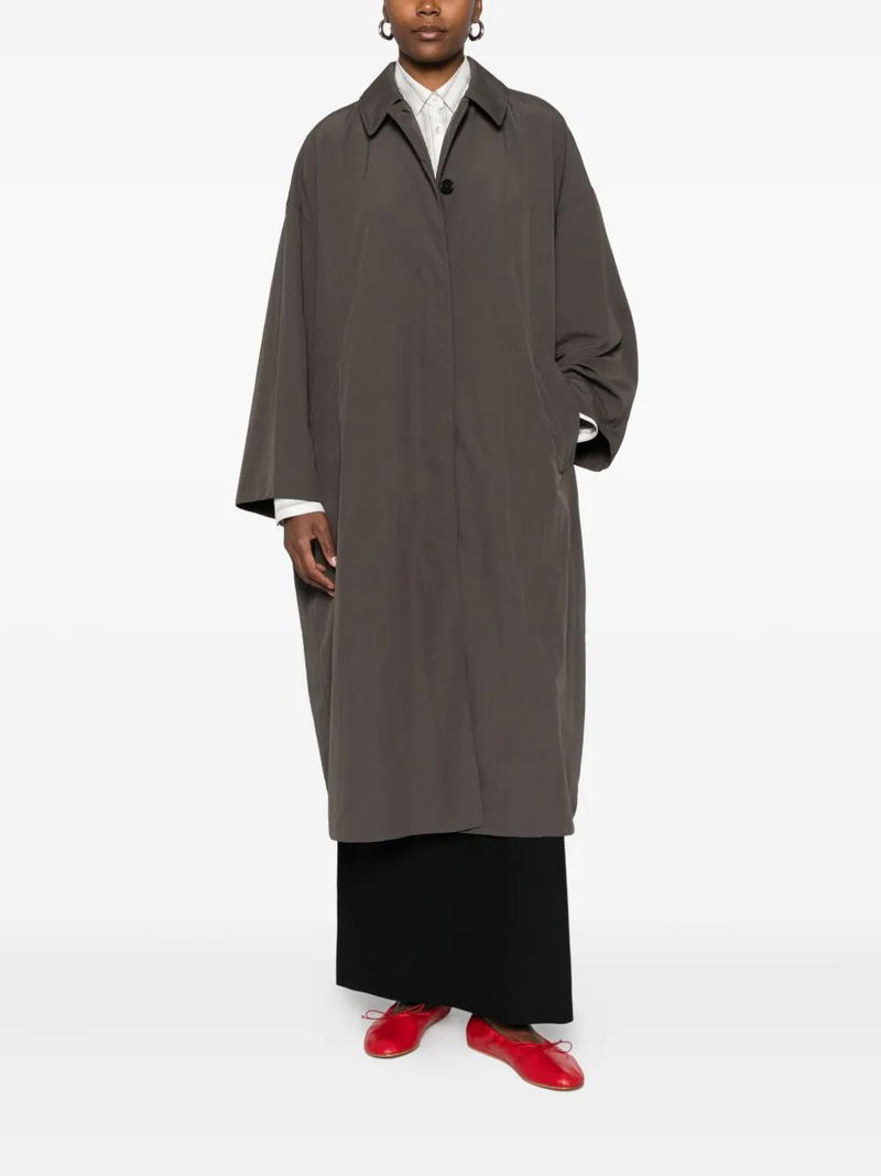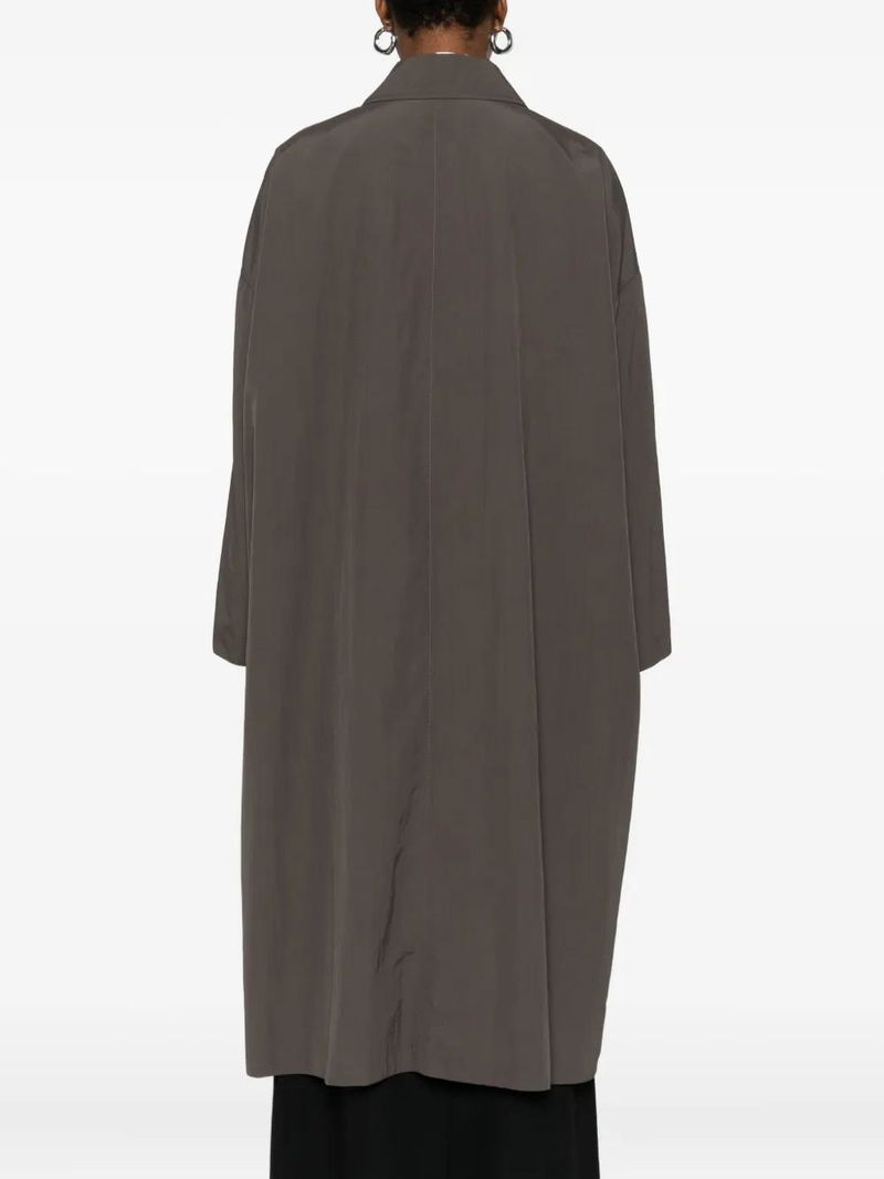 Taupe brown pointed collar front button fastening side welt pockets long sleeves.