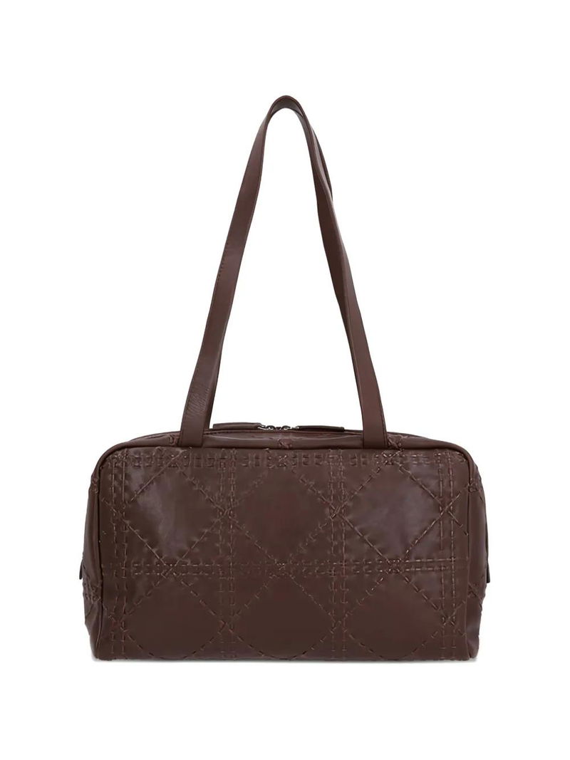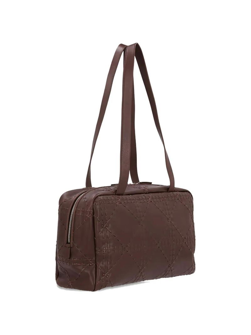 Brown, two long top handles, two-way zip fastening, quilted finish, main compartment.