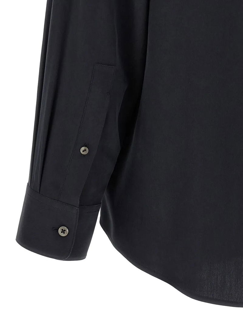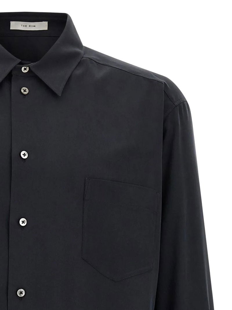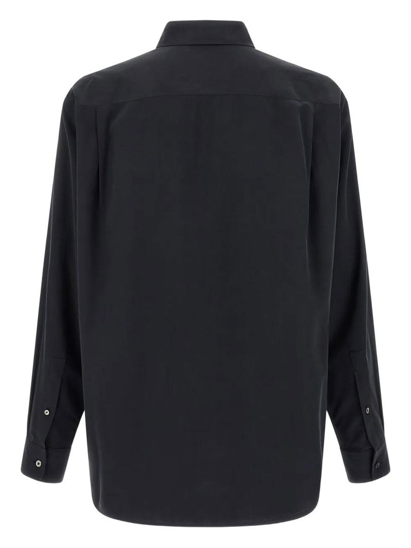Black, silk, front button closure, long sleeves, dropped shoulders.