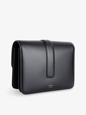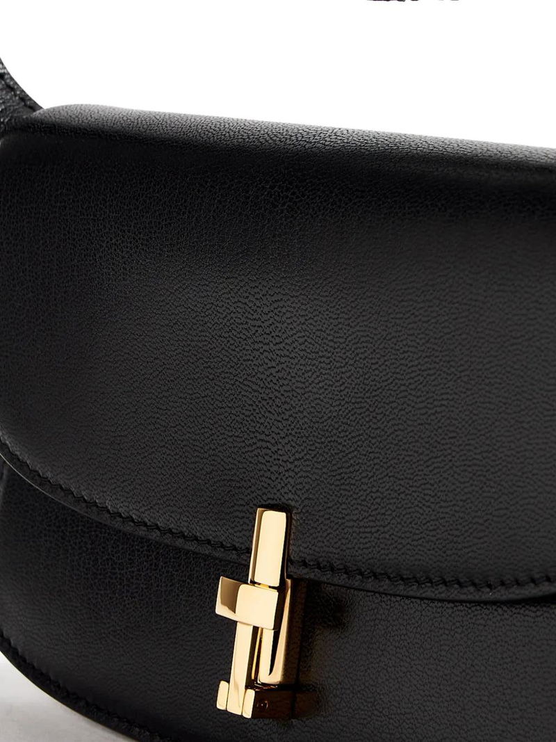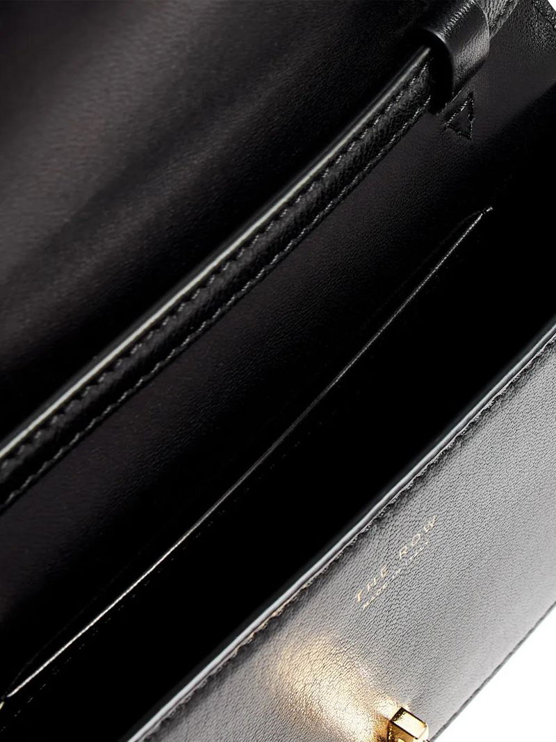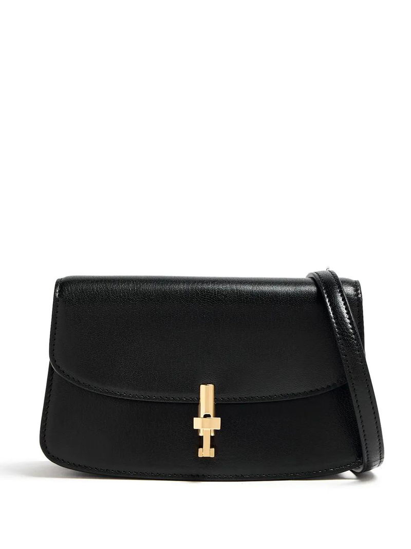 Black leather foldover top snap-lock closure adjustable shoulder strap internal slip pocket internal logo stamp gold-tone hardware.