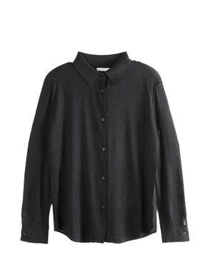 Black classic collar front button placket half-length sleeves buttoned cuffs short side slits straight hem.