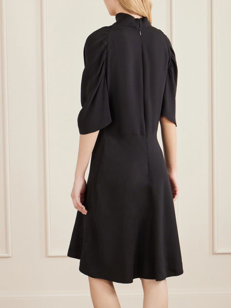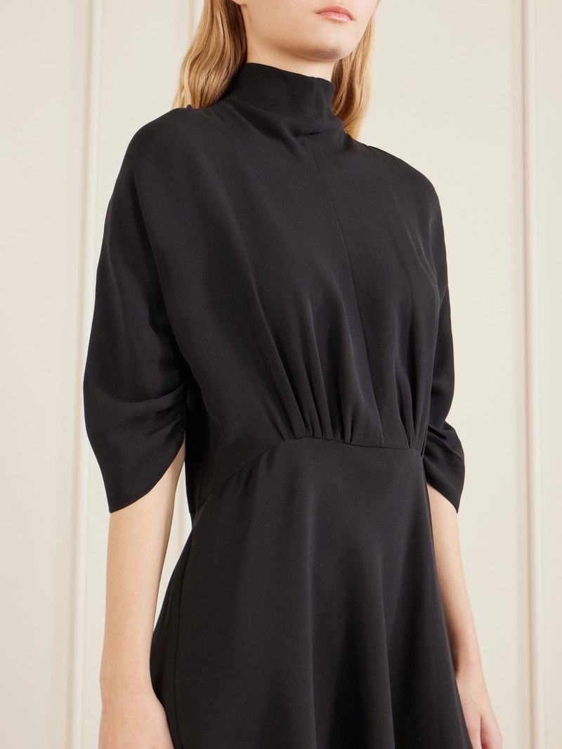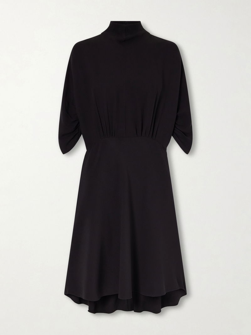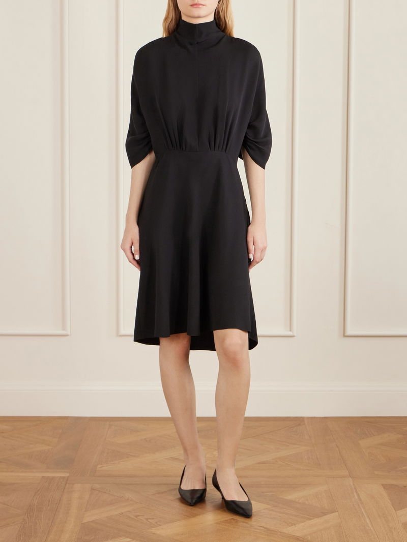 The Row’s 'Emmeline' midi dress reflects the house's signature restraint. Cut from fluid silk to drape softly over the body, it has batwing sleeves and a loose bodice with gentle gathering at the waist. Take style cues from the Spring '26 lookbook and team yours with point-toe kitten heels.