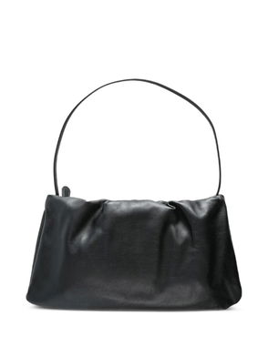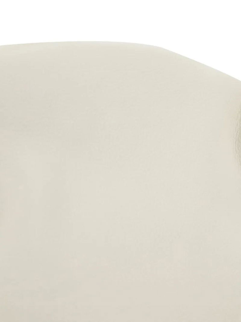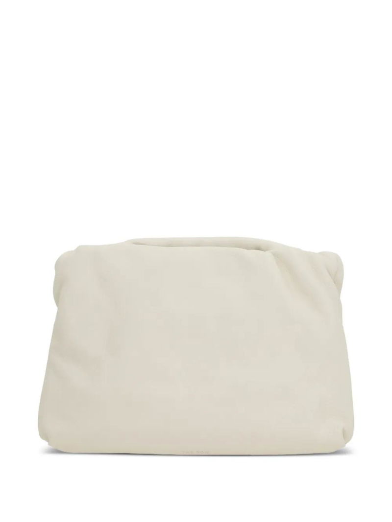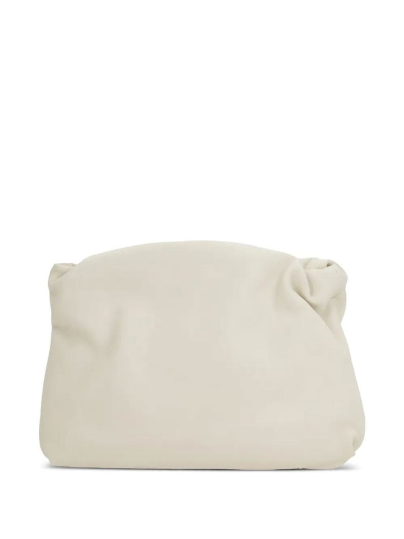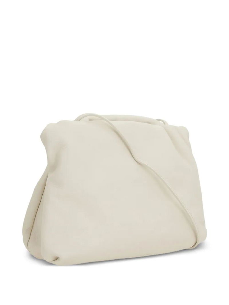 White leather construction gathered detailing hinged frame closure slender shoulder strap.