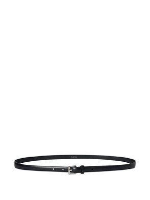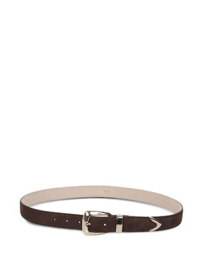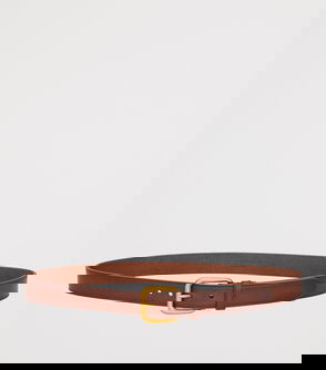 Brown, gold-tone hardware, pin-buckle fastening, belt loops, round edges.