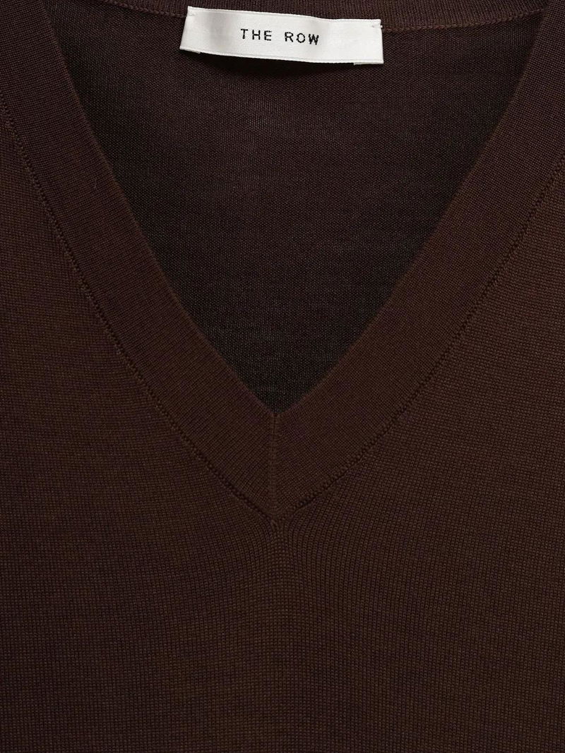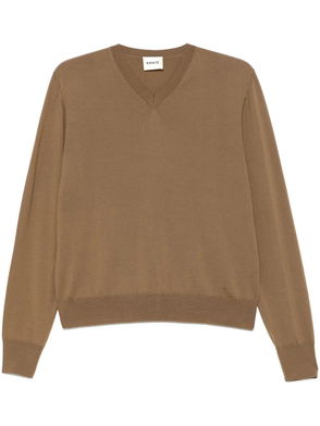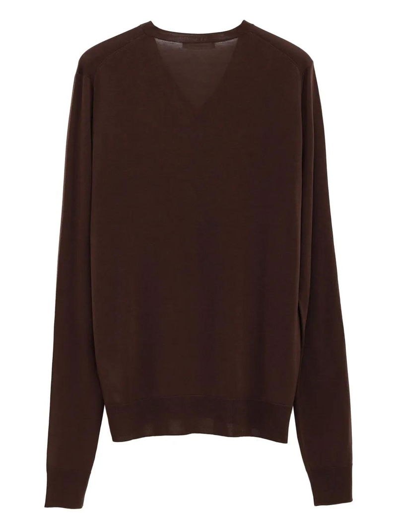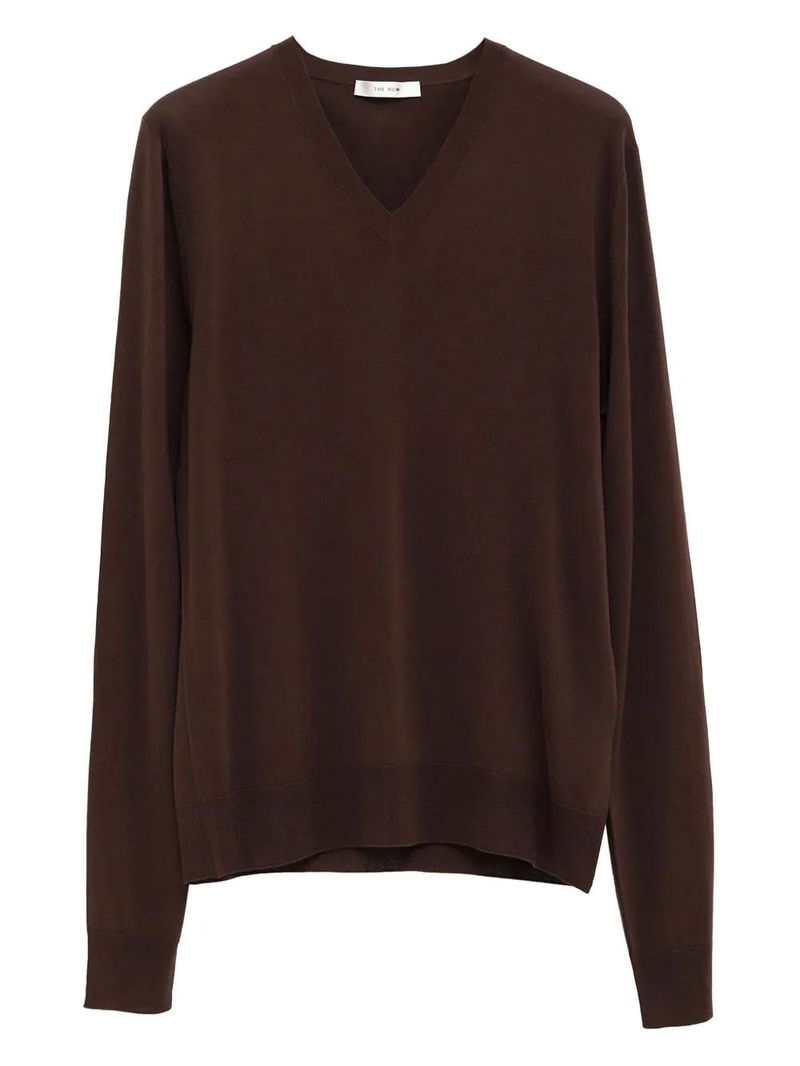 Brown V-neck ribbed trims lightweight knit long sleeves straight hem.