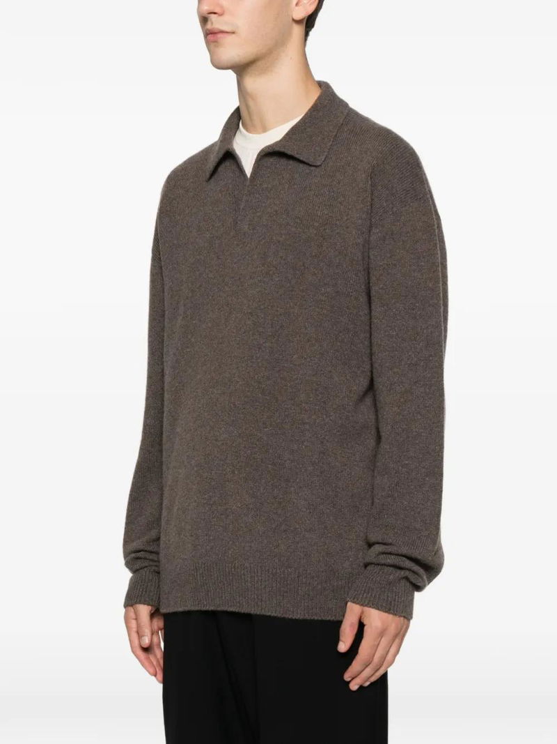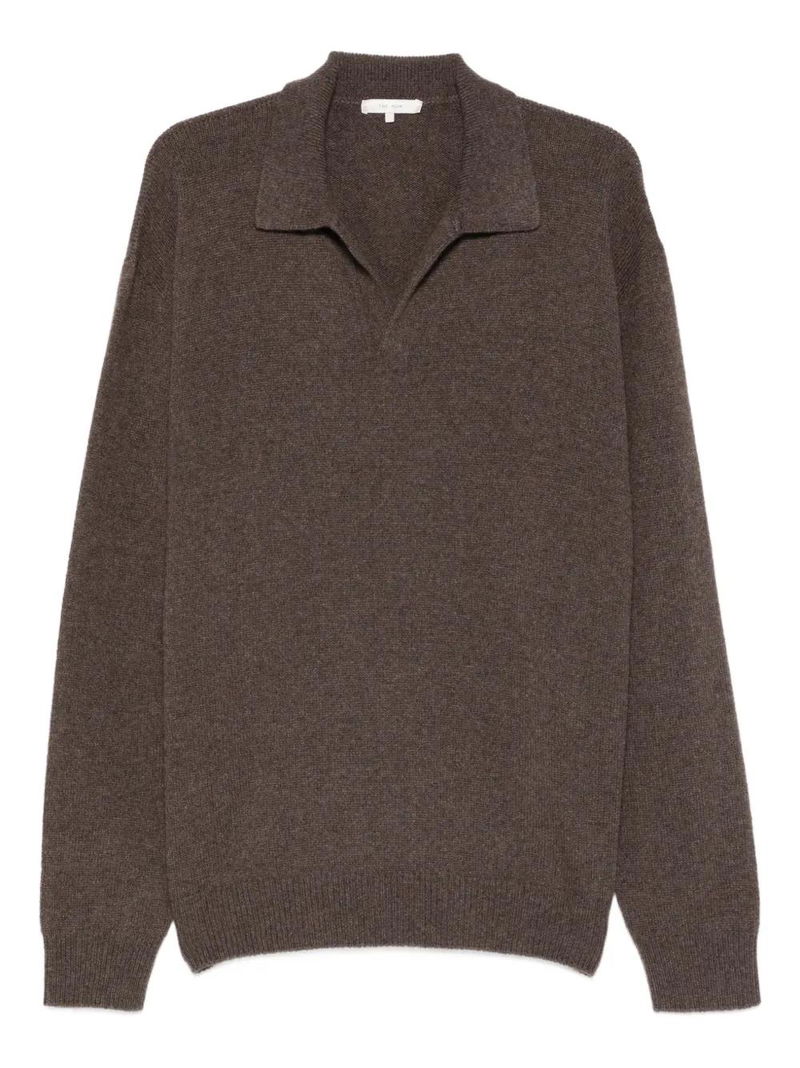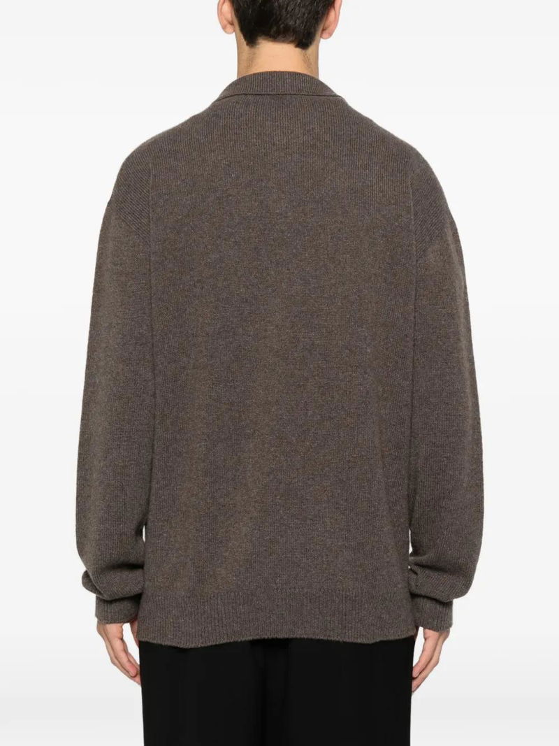 Dark sand polo collar V-neck long sleeves ribbed hem ribbed cuffs.